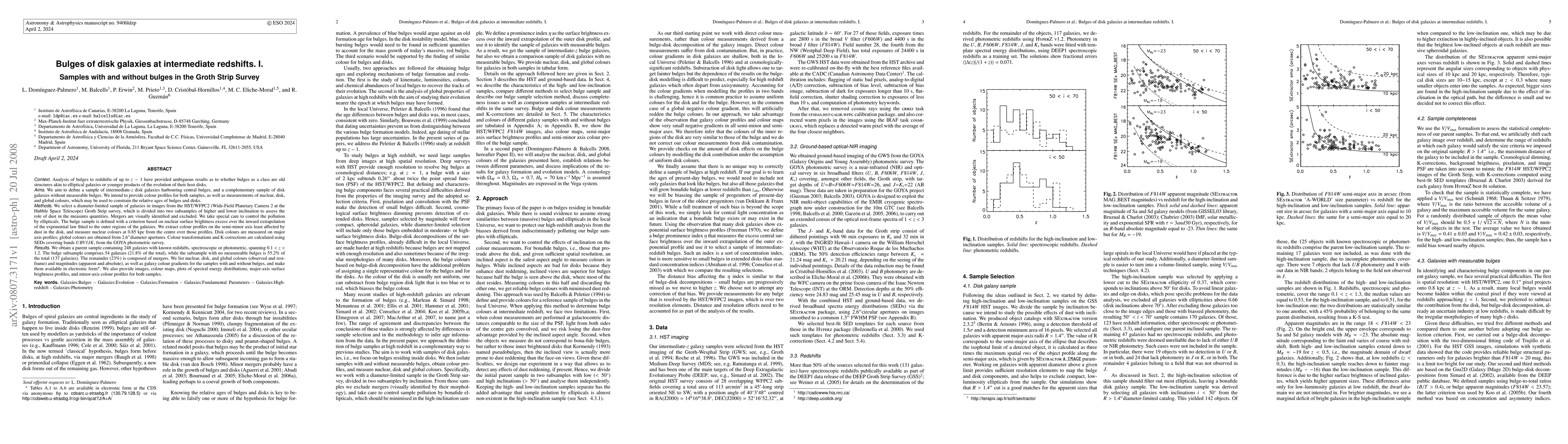 We aim to define a sample of intermediate-z disk galaxies harbouring central bulges, and a complementary sample of disk galaxies without measurable bulges. We intend to provide colour profiles for both samples, as well as measurements of nuclear, disk, and global colours, which may be used to constrain the relative ages of bulges and disks. We select a diameter-limited sample of galaxies in images from the HST/WFPC2 Groth Strip survey, which is divided into two subsamples of higher and lower inclination to assess the role of dust in the measures quantities. Mergers are visually identified and excluded. We take special care to control the pollution by ellipticals. The bulge sample is defined with a criterion based on nuclear surface brightness excess over the inward extrapolation of the exponential law fitted to the outer regions of the galaxies. We extract colour profiles on the semi-minor axis least affected by dust in the disk, and measure nuclear colours at 0.85 kpc from the centre over those profiles. Disk colours are measured on major axis profiles; global colours are obtained from 2.6"-diameter apertures. We obtain a parent sample containing 248 galaxies with known redshifts, spectroscopic or photometric, spanning 0.1 < z < 1.2. The bulge subsample comprises 54 galaxies (21.8% of the total), while the subsample with no measureable bulges is 55.2% of the total (137 galaxies). The remainder (23%) is composed of mergers. We list nuclear, disk, and global colours (observed and restframe) and magnitudes (apparent and absolute), as well as galaxy colour gradients for the samples with and without bulges. We also provide images, colour maps, plots of spectral energy distributions, major-axis surface brightness profiles, and minor-axis colour profiles for both samples.