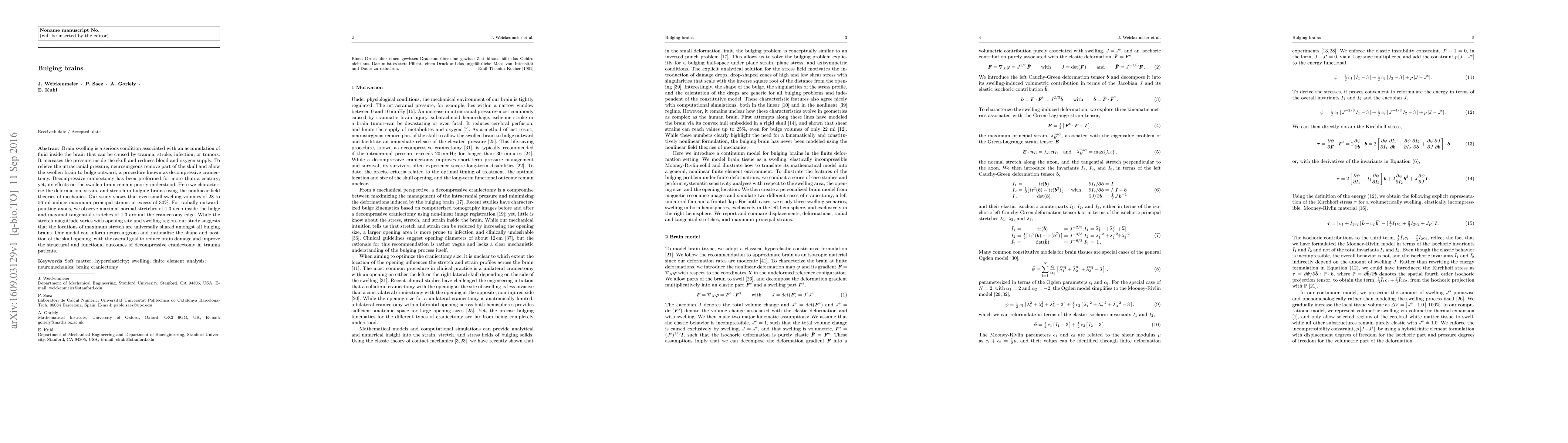 Brain swelling is a serious condition associated with an accumulation of fluid inside the brain that can be caused by trauma, stroke, infection, or tumors. It increases the pressure inside the skull and reduces blood and oxygen supply. To relieve the intracranial pressure, neurosurgeons remove part of the skull and allow the swollen brain to bulge outward, a procedure known as decompressive craniectomy. Decompressive craniectomy has been preformed for more than a century; yet, its effects on the swollen brain remain poorly understood. Here we characterize the deformation, strain, and stretch in bulging brains using the nonlinear field theories of mechanics. Our study shows that even small swelling volumes of 28 to 56 ml induce maximum principal strains in excess of 30%. For radially outward-pointing axons, we observe maximal normal stretches of 1.3 deep inside the bulge and maximal tangential stretches of 1.3 around the craniectomy edge. While the stretch magnitude varies with opening site and swelling region, our study suggests that the locations of maximum stretch are universally shared amongst all bulging brains. Our model can inform neurosurgeons and rationalize the shape and position of the skull opening, with the overall goal to reduce brain damage and improve the structural and functional outcomes of decompressive craniectomy in trauma patients.