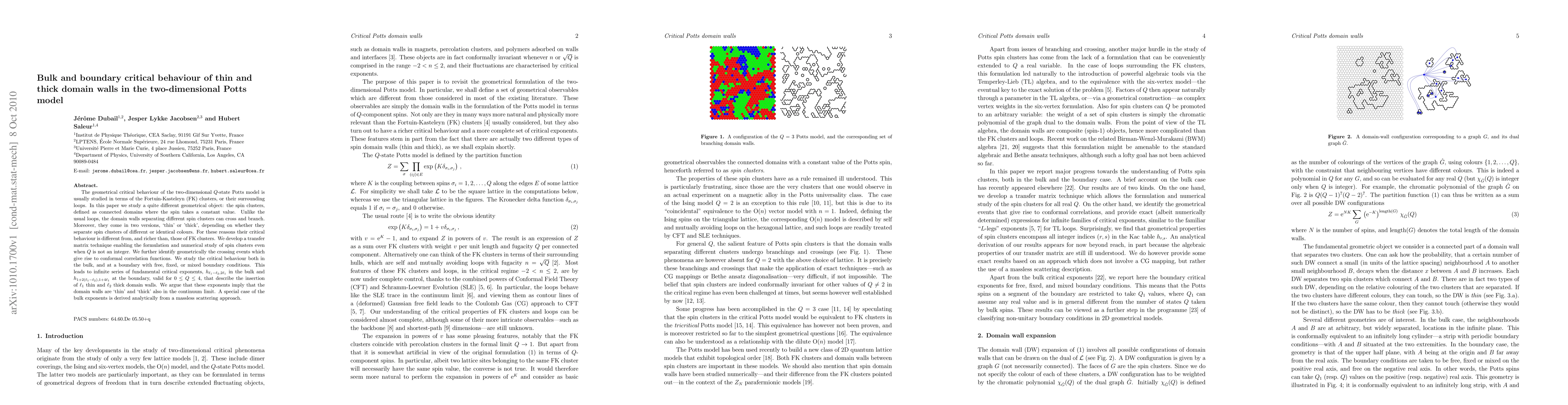 This paper investigates the critical behavior of thin and thick domain walls in the two-dimensional Potts model, focusing on spin clusters and their separating walls. The study develops a transfer matrix technique to numerically analyze these domain walls, identifying crossing events that lead to conformal correlation functions and deriving a series of critical exponents for both bulk and boundary conditions.