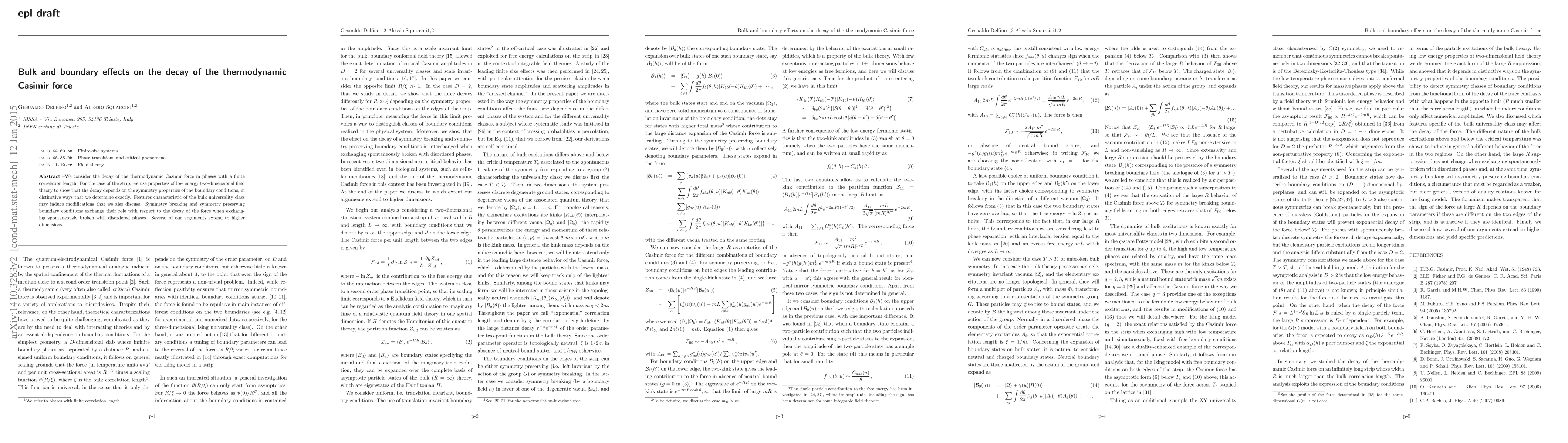 Researchers studied how a thermodynamic force called Casimir force decays in materials with specific boundary conditions, finding it depends on symmetry properties and exchanging roles between certain phases.