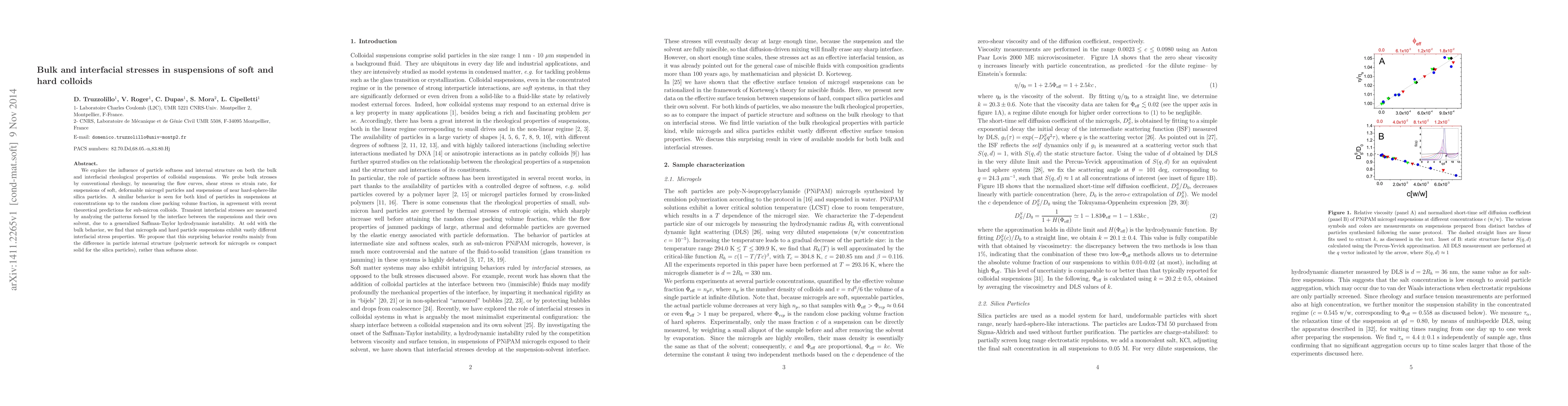 This research investigates the rheological properties of colloidal suspensions comprising soft deformable microgels and hard silica particles, finding similar bulk stress behavior up to random close packing but starkly different interfacial stress properties due to differences in particle internal structure rather than softness.