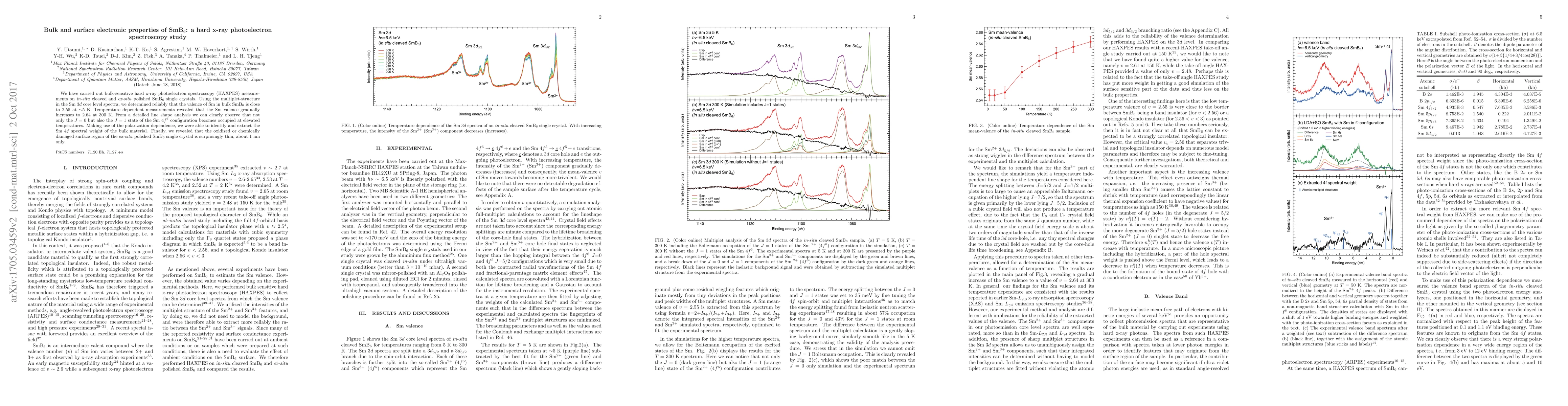 This study uses hard x-ray photoelectron spectroscopy to determine the valence state of Sm in SmB6, finding it increases from 2.55 at ~5 K to 2.64 at 300 K. The research also reveals that the Sm 4f spectral weight is present in the bulk, and identifies a thin, 1 nm oxidized surface layer in ex-situ polished samples.