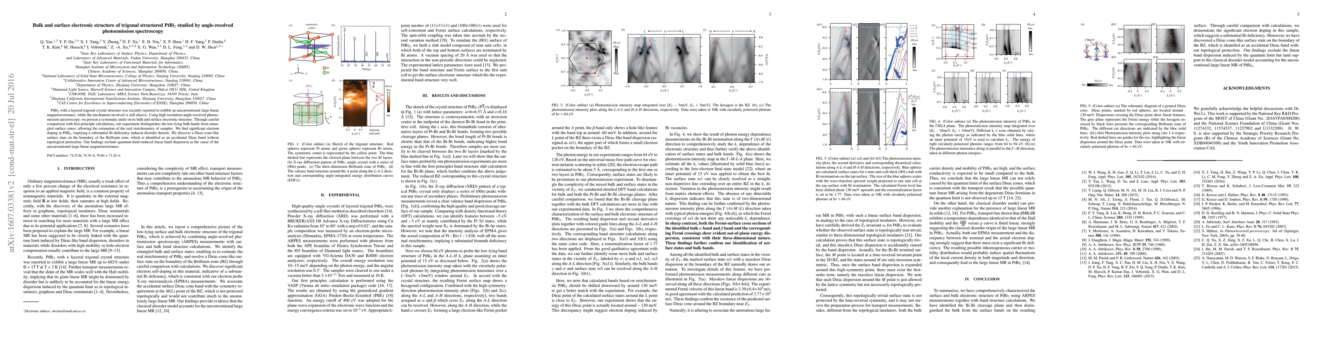 PtBi2 with a layered trigonal crystal structure was recently reported to exhibit an unconventional large linear magnetoresistance, while the mechanism involved is still elusive. Using high resolution angle-resolved photoemission spectroscopy, we present a systematic study on its bulk and surface electronic structure. Through careful comparison with first-principle calculations, our experiment distinguishes the low-lying bulk bands from entangled surface states, allowing the estimation of the real stoichiometry of samples. We find significant electron doping in PtBi2, implying a substantial Bi deficiency induced disorder therein. We discover a Dirac-cone-like surface state on the boundary of the Brillouin zone, which is identified as an accidental Dirac band without topological protection. Our findings exclude quantum-limit-induced linear band dispersion as the cause of the unconventional large linear magnetoresistance.