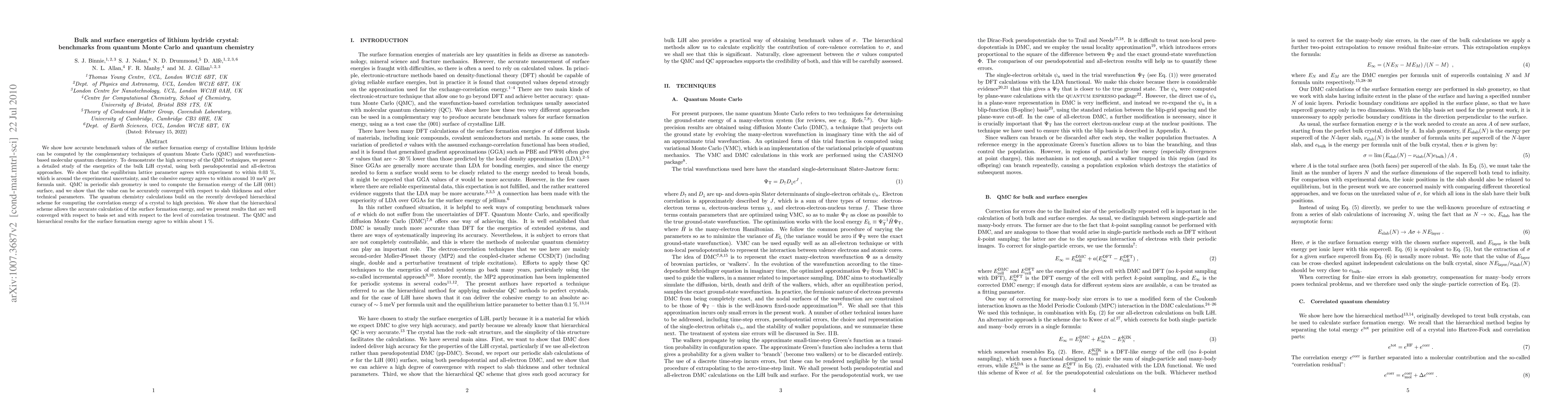 This paper benchmarks the surface formation energy of lithium hydride using quantum Monte Carlo (QMC) and quantum chemistry methods, demonstrating high accuracy in both bulk and surface energetics. The QMC approach shows excellent agreement with experimental lattice parameters and cohesive energy, while the hierarchical quantum chemistry scheme provides similarly precise surface formation energy results.