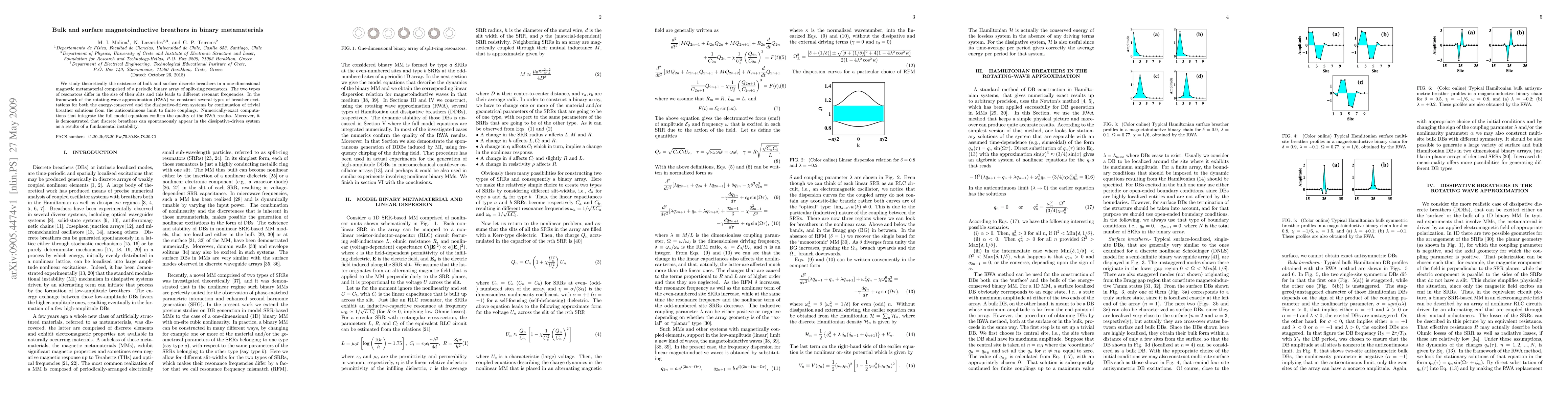 We study theoretically the existence of bulk and surface discrete breathers in a one-dimensional magnetic metamaterial comprised of a periodic binary array of split-ring resonators. The two types of resonators differ in the size of their slits and this leads to different resonant frequencies. In the framework of the rotating-wave approximation (RWA) we construct several types of breather excitations for both the energy-conserved and the dissipative-driven systems by continuation of trivial breather solutions from the anticontinuous limit to finite couplings. Numerically-exact computations that integrate the full model equations confirm the quality of the RWA results. Moreover, it is demonstrated that discrete breathers can spontaneously appear in the dissipative-driven system as a results of a fundamental instability.