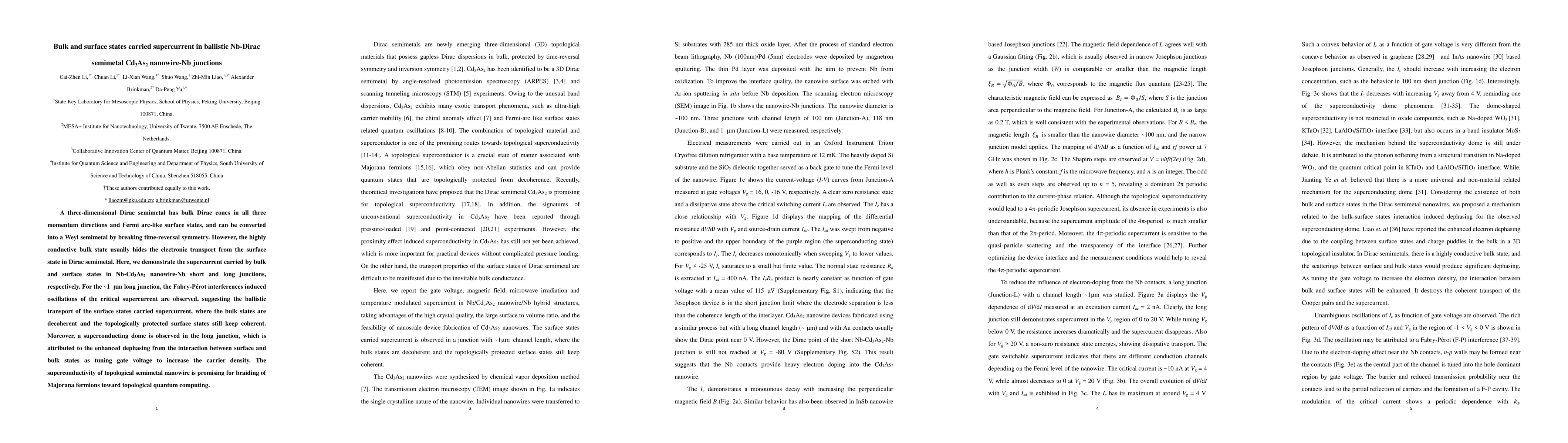 This paper investigates supercurrent in Nb-Cd3As2 nanowire-Nb junctions, revealing ballistic transport of surface states and a superconducting dome due to enhanced dephasing from surface-bulk interactions, showcasing potential for topological quantum computing.