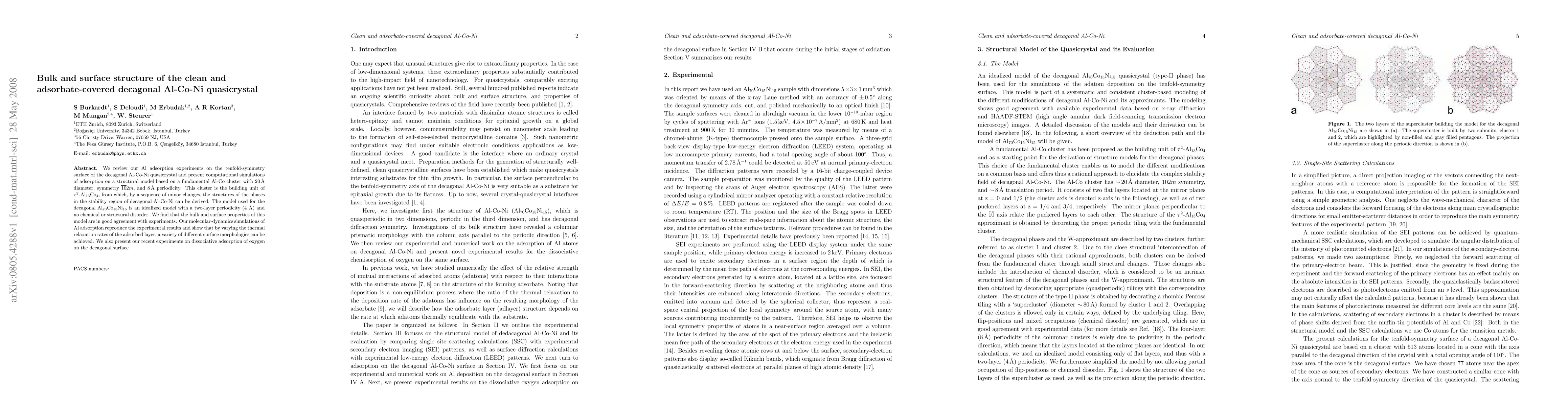 We review our Al adsorption experiments on the tenfold-symmetry surface of the decagonal Al-Co-Ni quasicrystal and present computational simulations of adsorption on a structural model based on a fundamental Al-Co cluster with 20 \AA diameter, symmetry $\bar{10}2m$, and 8 \AA periodicity. This cluster is the building unit of $\tau ^2$-Al$_{13}$Co$_4$, from which, by a sequence of minor changes, the structures of the phases in the stability region of decagonal Al-Co-Ni can be derived. The model used for the decagonal Al$_{70}$Co$_{15}$Ni$_{15}$ is an idealized model with a two-layer periodicity (4 \AA) and no chemical or structural disorder. We find that the bulk and surface properties of this model are in good agreement with experiments. Our molecular-dynamics simulations of Al adsorption reproduce the experimental results and show that by varying the thermal relaxation rates of the adsorbed layer, a variety of different surface morphologies can be achieved. We also present our recent experiments on dissociative adsorption of oxygen on the decagonal surface.