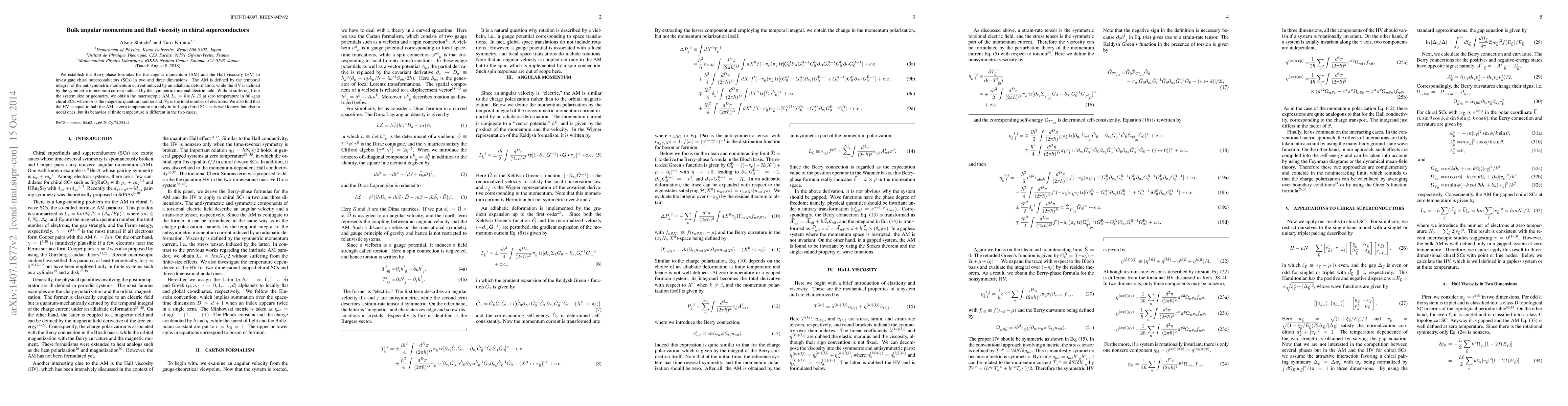 We establish the Berry-phase formulas for the angular momentum (AM) and the Hall viscosity (HV) to investigate chiral superconductors (SCs) in two and three dimensions. The AM is defined by the temporal integral of the anti-symmetric momentum current induced by an adiabatic deformation, while the HV is defined by the symmetric momentum current induced by the symmetric torsional electric field. Without suffering from the system size or geometry, we obtain the macroscopic AM $L_z = \hbar m N_0/2$ at zero temperature in full-gap chiral SCs, where $m$ is the magnetic quantum number and $N_0$ is the total number of electrons. We also find that the HV is equal to half the AM at zero temperature not only in full-gap chiral SCs as is well-known but also in nodal ones, but its behavior at finite temperature is different in the two cases.