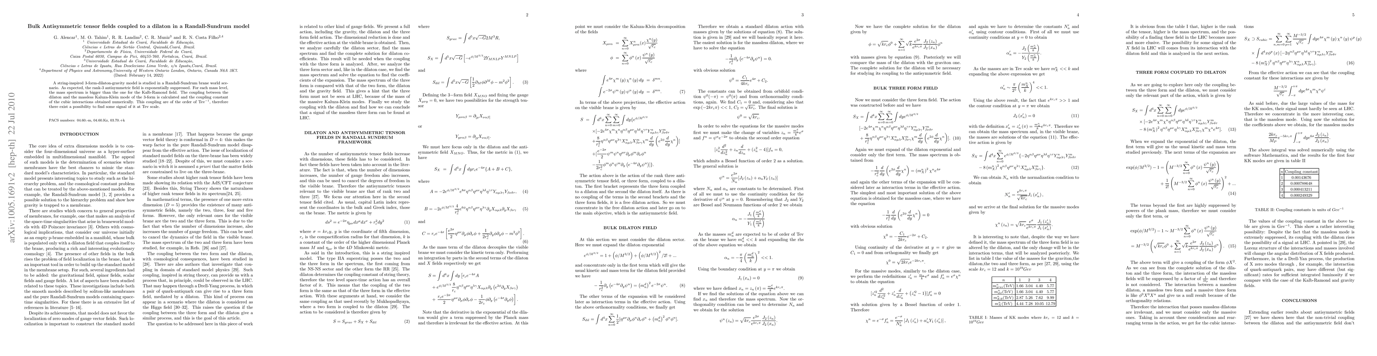 A string-inspired 3-form-dilaton-gravity model is studied in a Randall-Sundrum brane world scenario. As expected, the rank-3 antisymmetric field is exponentially suppressed. For each mass level, the mass spectrum is bigger than the one for the Kalb-Ramond field. The coupling between the dilaton and the massless Kaluza-Klein mode of the 3-form is calculated and the coupling constant of the cubic interactions obtained numerically. This coupling are of the order of Tev$^{-1}$, therefore there exist a possibility to find some signal of it at Tev scale.