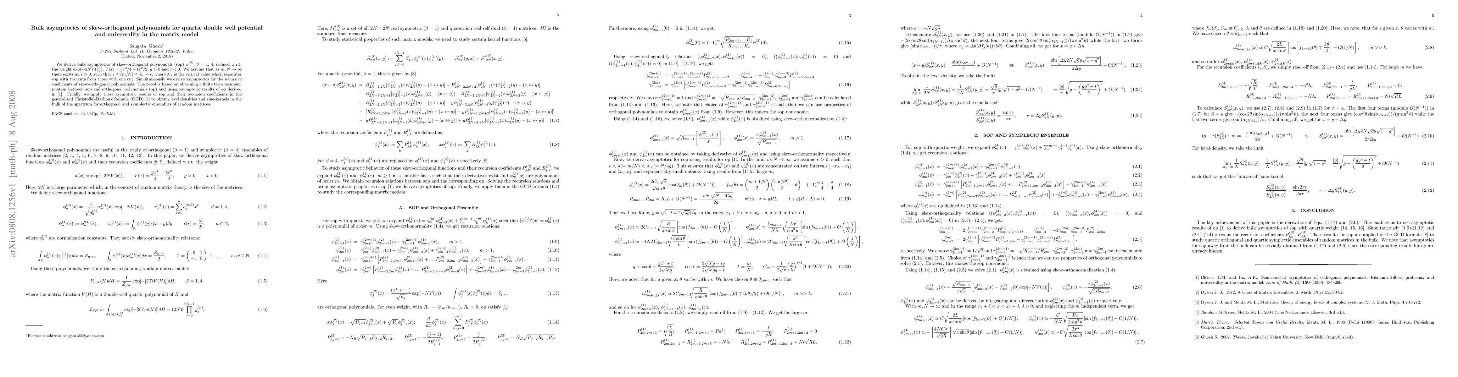 This paper derives the bulk asymptotics of skew-orthogonal polynomials associated with a quartic double well potential and explores universality in matrix models. The authors utilize a finite term recursion relation and results from orthogonal polynomials to find these asymptotics, subsequently applying them to obtain level densities and sine-kernels for random matrix ensembles.