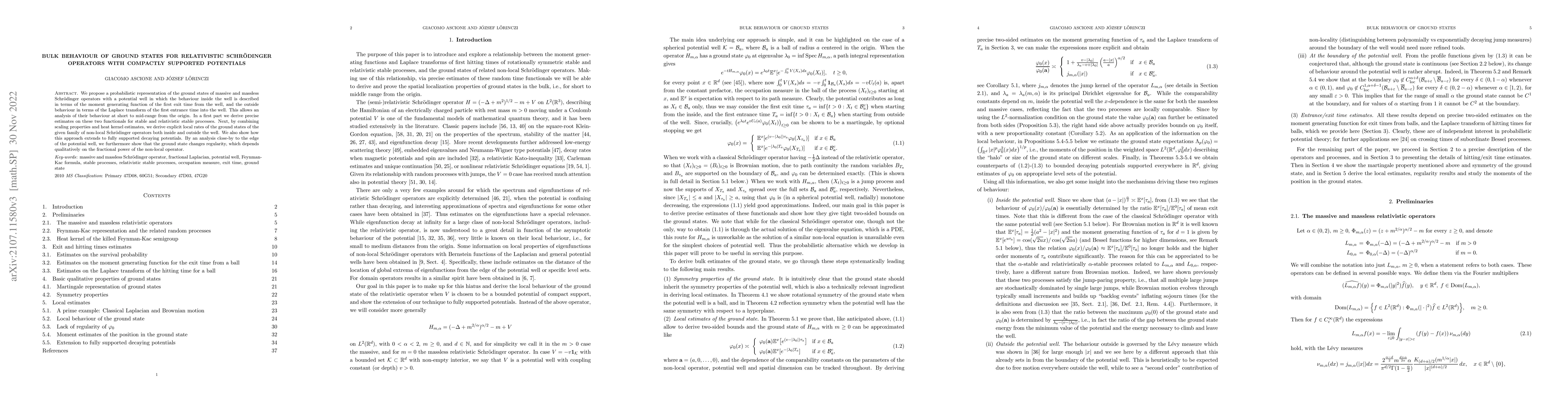 This paper proposes a probabilistic framework to analyze the ground states of relativistic Schrödinger operators with compactly supported potentials, using moment generating functions and Laplace transforms. It derives explicit local rates for the behavior of these states and shows how the regularity of the ground state changes near the potential well's edge, depending on the operator's fractional power.