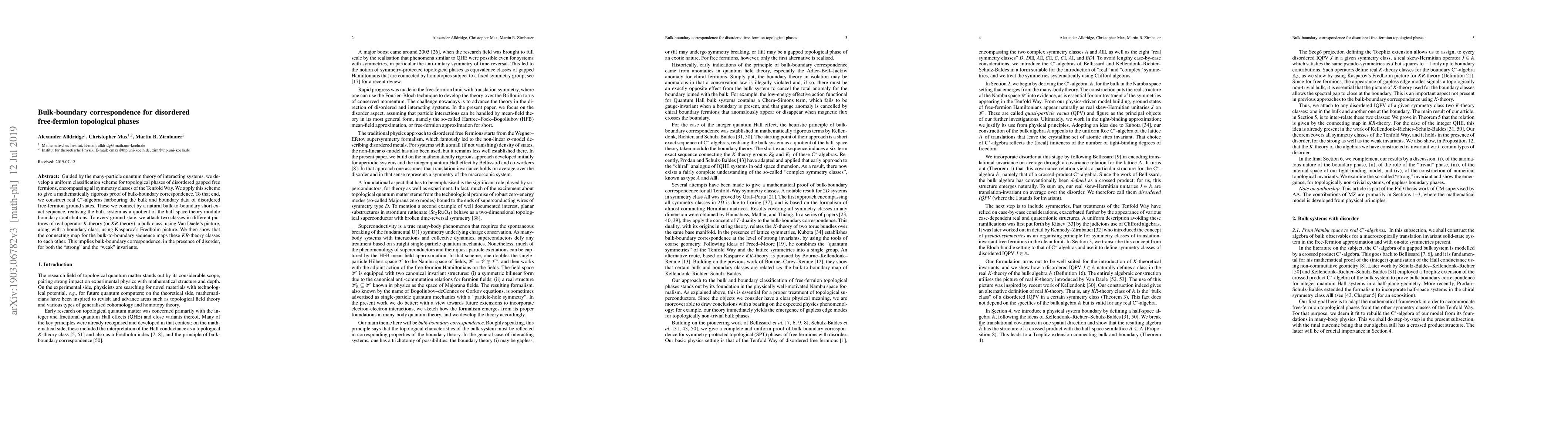 This paper develops a classification scheme for topological phases of disordered free fermions, proving bulk-boundary correspondence using real C$^\ast$-algebras and $KR$-theory. It establishes a rigorous connection between bulk and boundary states through a short exact sequence, demonstrating the correspondence for both strong and weak invariants.