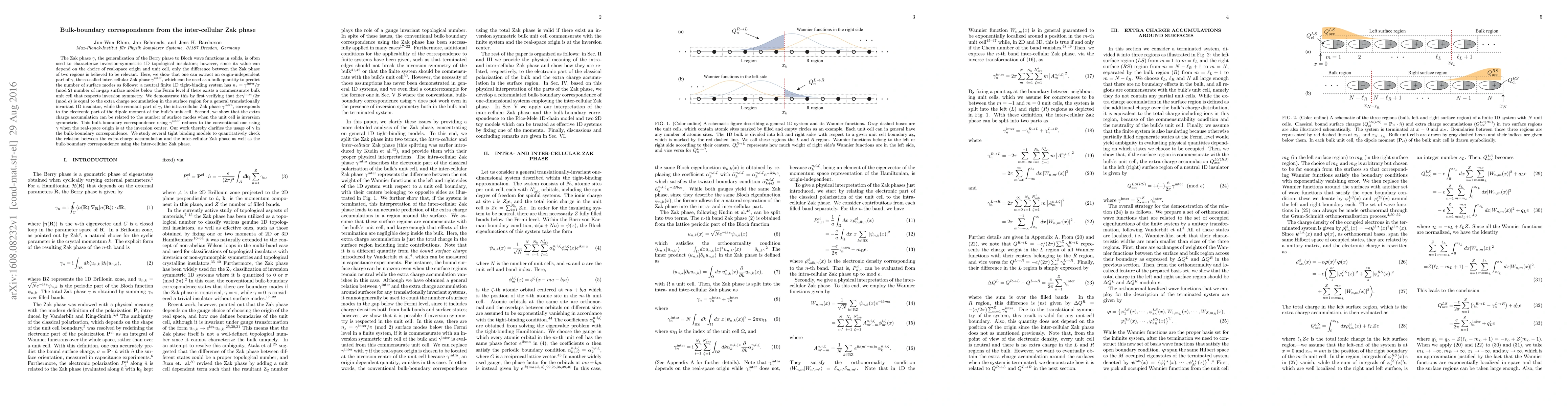 The Zak phase $\gamma$, the generalization of the Berry phase to Bloch wave functions in solids, is often used to characterize inversion-symmetric 1D topological insulators; however, since its value can depend on the choice of real-space origin and unit cell, only the difference between the Zak phase of two regions is believed to be relevant. Here, we show that one can extract an origin-independent part of $\gamma$, the so-called inter-cellular Zak phase $\gamma^{\mathrm{inter}}$, which can be used as a bulk quantity to predict the number of surface modes as follows: a neutral finite 1D tight-binding system has $n_s = \gamma^{\mathrm{inter}}/\pi$ (mod 2) number of in-gap surface modes below the Fermi level if there exists a commensurate bulk unit cell that respects inversion symmetry. We demonstrate this by first verifying that $\pm e\gamma^{\mathrm{inter}}/2\pi$ (mod $e$) is equal to the extra charge accumulation in the surface region for a general translationally invariant 1D insulator, while the remnant part of $\gamma$, the intra-cellular Zak phase $\gamma^{\mathrm{intra}}$, corresponds to the electronic part of the dipole moment of the bulk's unit cell. Second, we show that the extra charge accumulation can be related to the number of surface modes when the unit cell is inversion symmetric. This bulk-boundary correspondence using $\gamma^{\mathrm{inter}}$ reduces to the conventional one using $\gamma$ when the real-space origin is at the inversion center. Our work thereby clarifies the usage of $\gamma$ in the bulk-boundary correspondence. We study several tight binding models to quantitatively check the relation between the extra charge accumulation and the inter-cellular Zak phase as well as the bulk-boundary correspondence using the inter-cellular Zak phase.