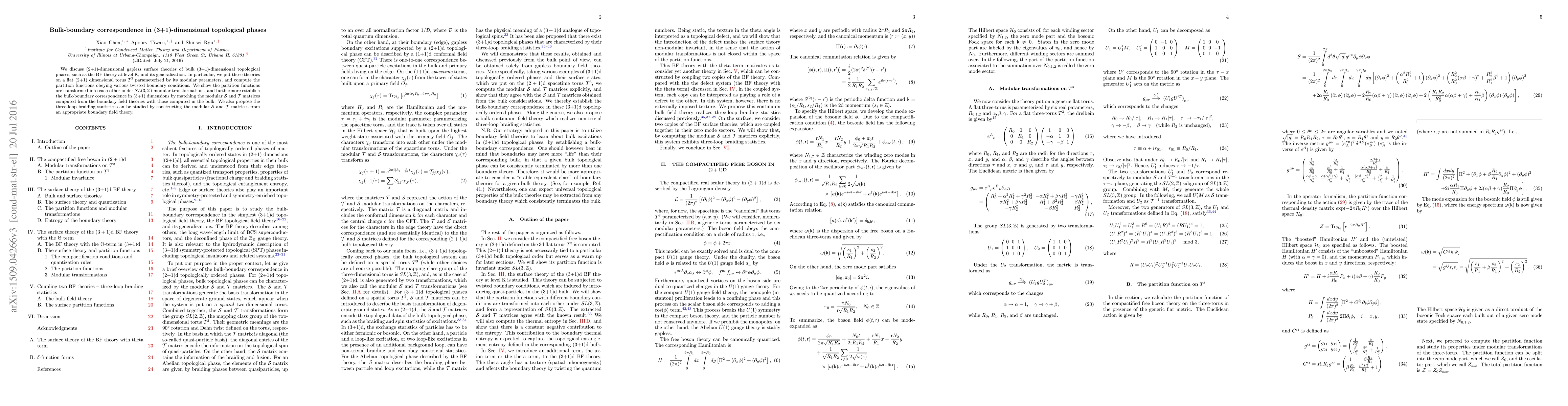 This paper explores (2+1)-dimensional gapless surface theories of (3+1)-dimensional topological phases, demonstrating the bulk-boundary correspondence through the equivalence of modular transformations and partition functions under $SL(3,\mathbb{Z})$. It also proposes a method to study three-loop braiding statistics via boundary field theories.