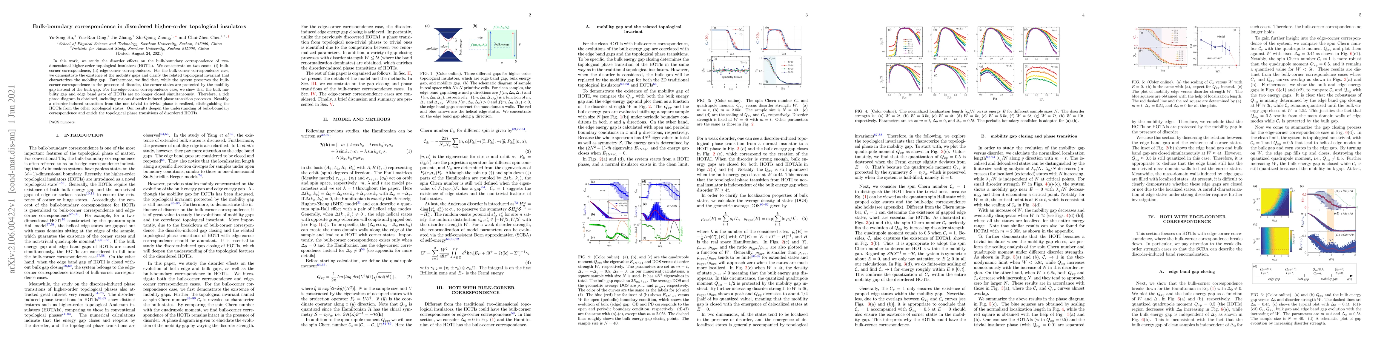 This paper investigates how disorder impacts the bulk-boundary correspondence in two-dimensional higher-order topological insulators, focusing on bulk-corner and edge-corner correspondences. It reveals that corner states remain protected by mobility gaps rather than bulk gaps, and introduces a rich phase diagram with disorder-induced transitions, highlighting unique characteristics of these topological phases.