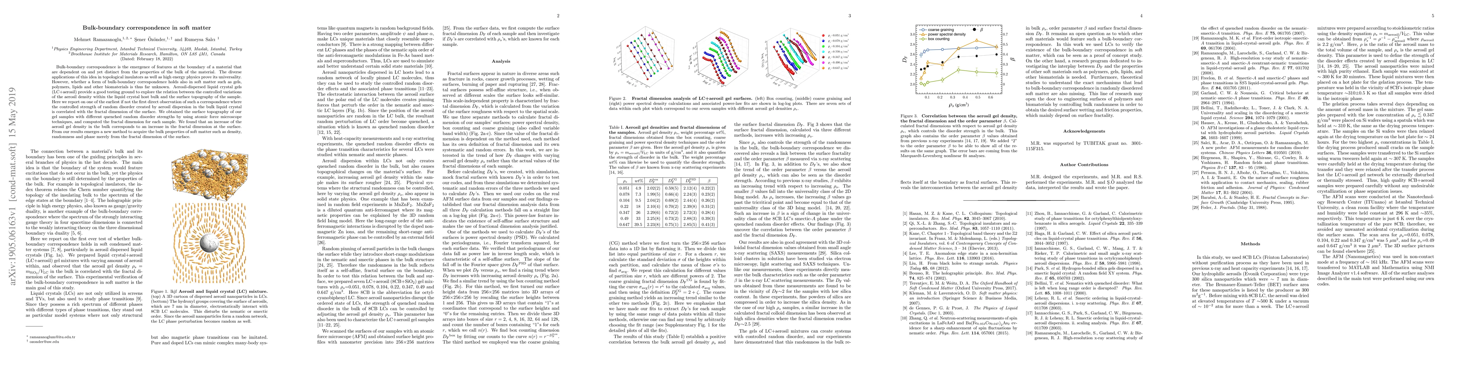 Bulk-boundary correspondence is the emergence of features at the boundary of a material that are dependent on and yet distinct from the properties of the bulk of the material. The diverse applications of this idea in topological insulators as well as high energy physics prove its universality. However, whether a form of bulk-boundary correspondence holds also in soft matter such as gels, polymers, lipids and other biomaterials is thus far unknown. Aerosil-dispersed liquid crystal gels (LC+aerosil) provide a good testing ground to explore the relation between the controlled variations of the aerosil density within the liquid crystal host bulk and the surface topography of the sample. Here we report on one of the earliest if not the first direct observation of such a correspondence where the controlled strength of random disorder created by aerosil dispersion in the bulk liquid crystal is correlated with the fractal dimension of the surface. We obtained the surface topography of our gel samples with different quenched random disorder strengths by using atomic force microscope techniques, and computed the fractal dimension for each sample. We found that an increase of the aerosil gel density in the bulk corresponds to an increase in the fractal dimension at the surface. From our results emerges a new method to acquire the bulk properties of soft matter such as density, randomness and phase merely from the fractal dimension of the surface.