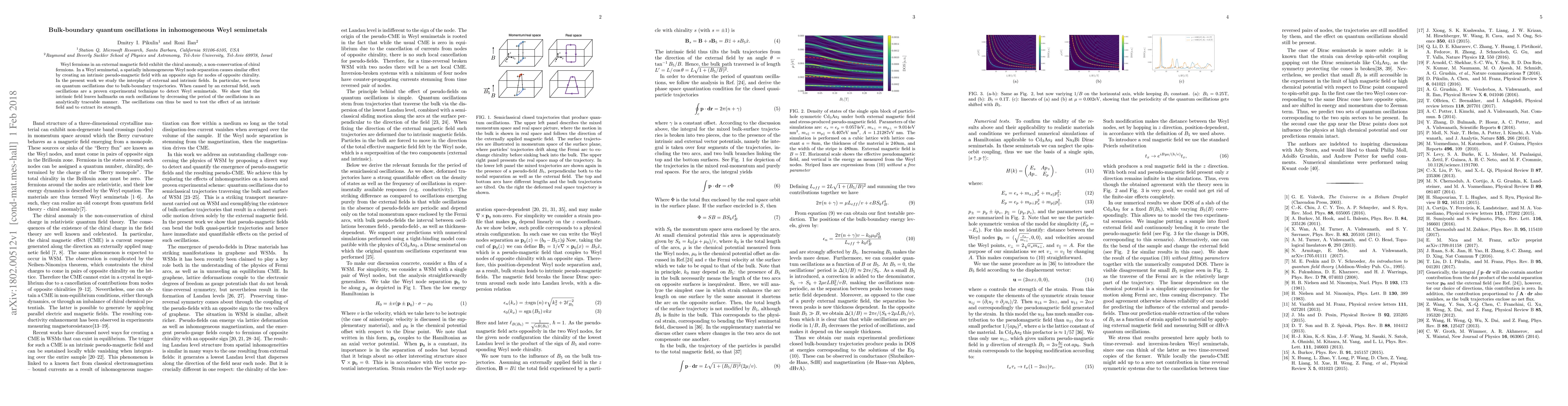 Weyl fermions in an external magnetic field exhibit the chiral anomaly, a non-conservation of chiral fermions. In a Weyl semimetal, a spatially inhomogeneous Weyl node separation causes similar effect by creating an intrinsic pseudo-magnetic field with an opposite sign for nodes of opposite chirality. In the present work we study the interplay of external and intrinsic fields. In particular, we focus on quantum oscillations due to bulk-boundary trajectories. When caused by an external field, such oscillations are a proven experimental technique to detect Weyl semimetals. We show that the intrinsic field leaves hallmarks on such oscillations by decreasing the period of the oscillations in an analytically traceable manner. The oscillations can thus be used to test the effect of an intrinsic field and to extract its strength.