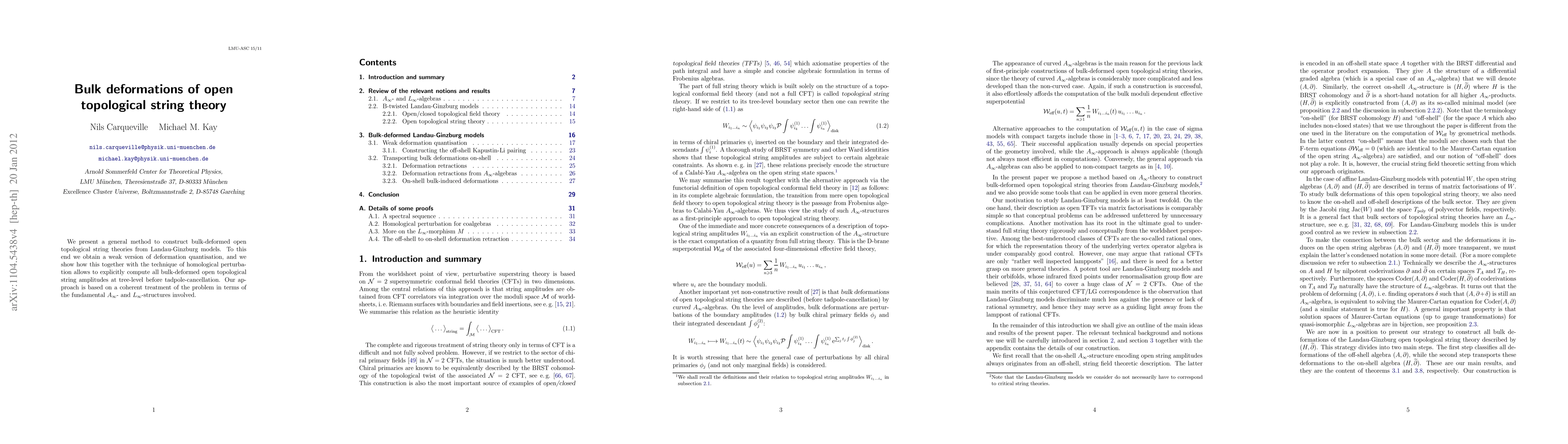 This paper introduces a new method for constructing bulk-deformed open topological string theories from Landau-Ginzburg models. It employs deformation quantisation and homological perturbation techniques to compute tree-level amplitudes, leveraging A-infinity and L-infinity structures.