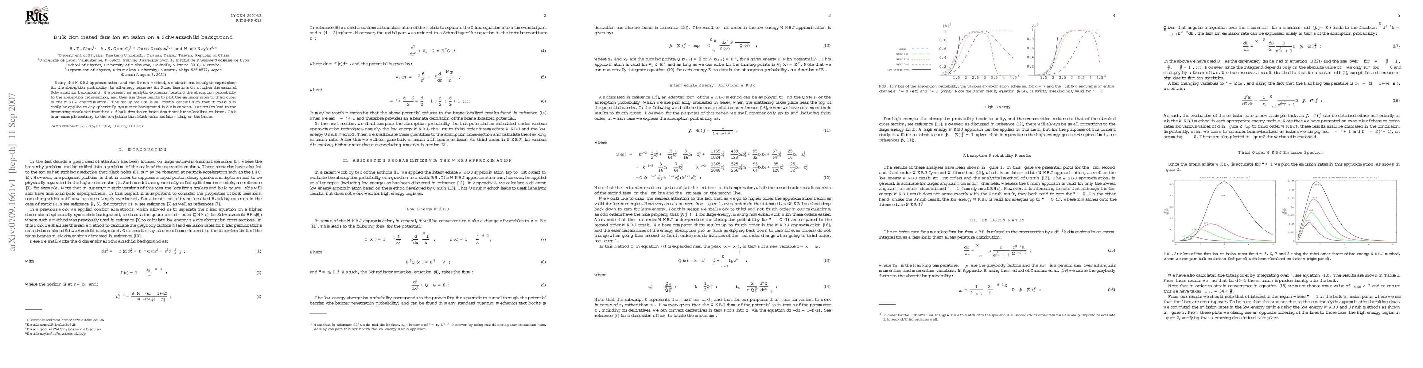 Using the WKBJ approximation, and the Unruh method, we obtain semi-analytic expressions for the absorption probability (in all energy regimes) for Dirac fermions on a higher dimensional Schwarzschild background. We present an analytic expression relating the absorption probability to the absorption cross-section, and then use these results to plot the emission rates to third order in the WKBJ approximation. The set-up we use is sufficiently general such that it could also easily be applied to any spherically symmetric background in $d$-dimensions. Our results lead to the interesting conclusion that for $d>5$ bulk fermion emission dominates brane localised emission. This is an example contrary to the conjecture that black holes radiate mainly on the brane.
