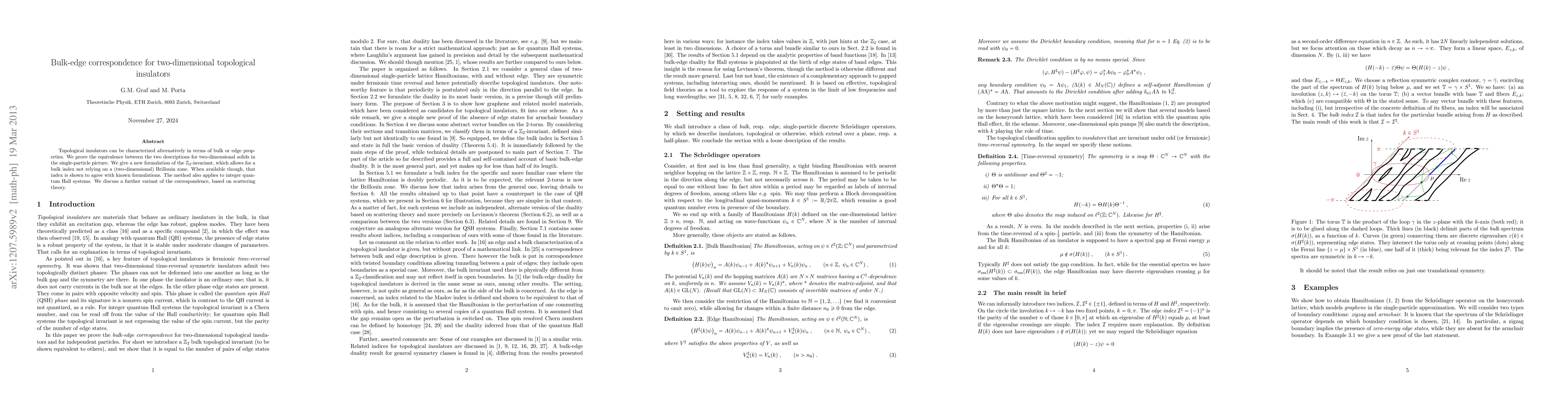 Topological insulators can be characterized alternatively in terms of bulk or edge properties. We prove the equivalence between the two descriptions for two-dimensional solids in the single-particle picture. We give a new formulation of the $\mathbb{Z}_{2}$-invariant, which allows for a bulk index not relying on a (two-dimensional) Brillouin zone. When available though, that index is shown to agree with known formulations. The method also applies to integer quantum Hall systems. We discuss a further variant of the correspondence, based on scattering theory.