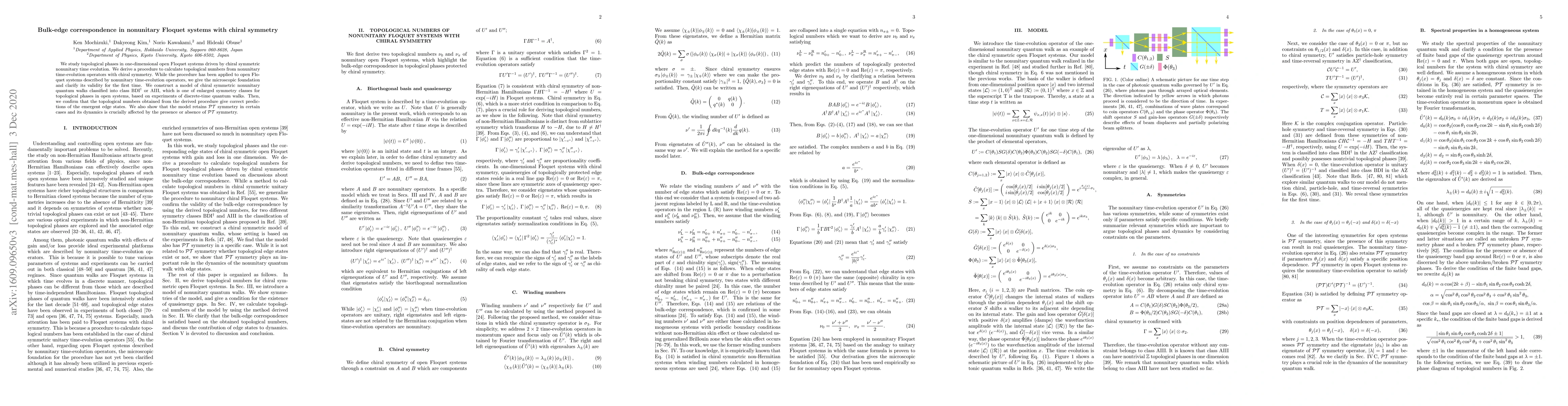 This paper derives a method to calculate topological numbers in nonunitary Floquet systems with chiral symmetry, establishes its microscopic foundation, and applies it to classify quantum walks into BDI$^\dagger$ or AIII classes, confirming the emergence of edge states and the impact of $\mathcal{PT}$ symmetry on dynamics.