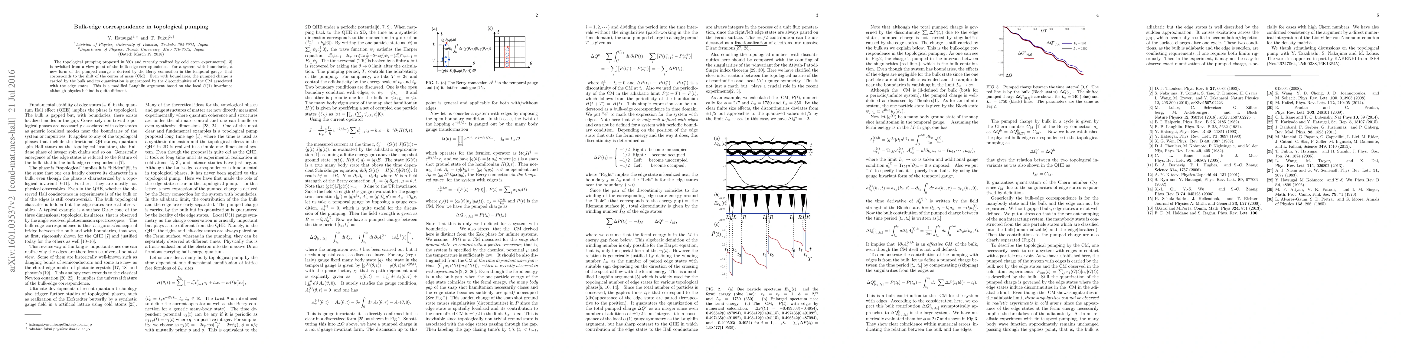 This paper explores the bulk-edge correspondence in topological pumping, demonstrating that while the pumping is driven by the bulk, its quantization is ensured by the singular motion of the center of mass due to edge states. A gauge invariant formulation of the pumped charge is introduced using the temporal gauge to establish this correspondence.