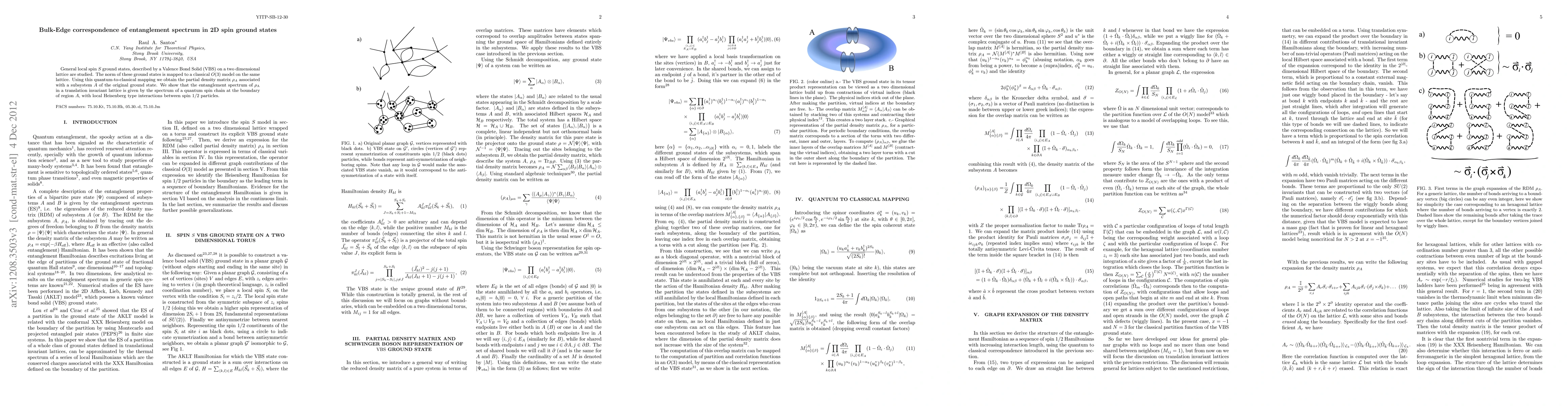 General local spin $S$ ground states, described by a Valence Bond Solid (VBS) on a two dimensional lattice are studied. The norm of these ground states is mapped to a classical O(3) model on the same lattice. Using this quantum-to-classical mapping we obtain the partial density matrix $\rho_{A}$ associated with a subsystem ${A}$ of the original ground state. We show that the entanglement spectrum of $\rho_{\rm A}$ in a translation invariant lattice is given by the spectrum of a quantum spin chain at the boundary of region $A$, with local Heisenberg type interactions between spin 1/2 particles.