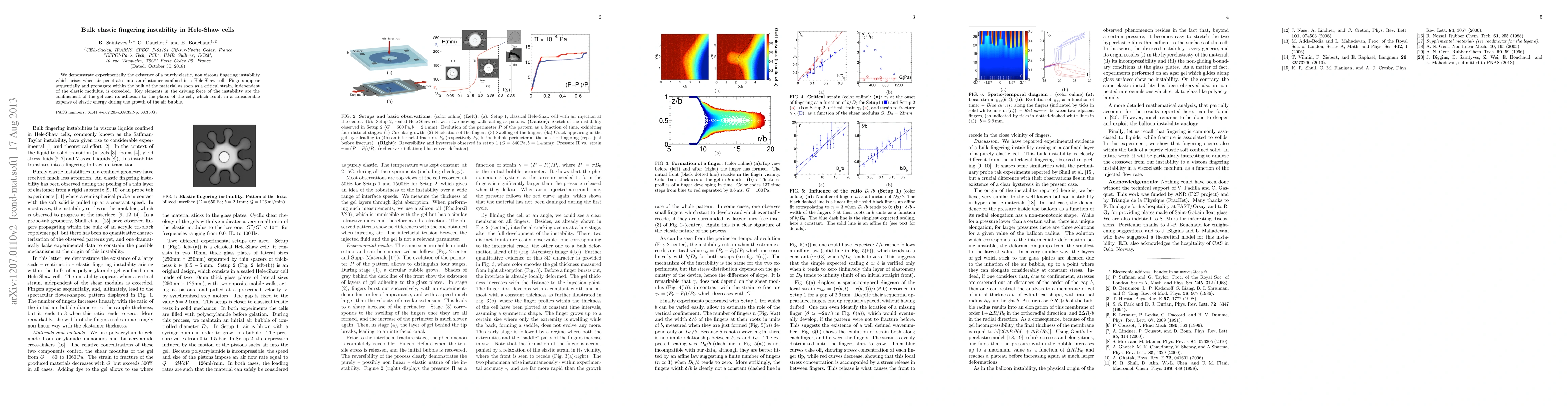 We demonstrate experimentally the existence of a purely elastic fingering instability which arises when air penetrates into an elastomer confined in a Hele-Shaw cell. Fingers appear sequentially and propagate within the bulk of the material as soon as a critical strain, independent of the elastic modulus, is exceeded. Their width depends non-linearly on the distance between the confining glass plates. A key element in the driving force of the instability is the adhesion of layers of gels to the plates, which results in a considerable expense of elastic energy during the growth of the air bubble.