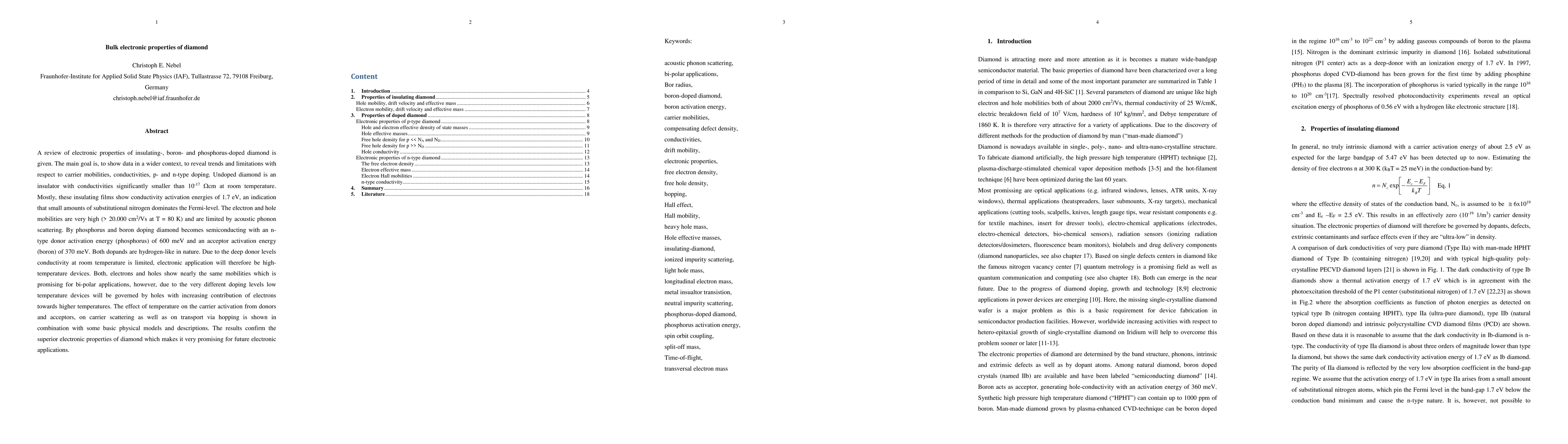 This paper reviews the electronic properties of insulating and doped diamond, highlighting high electron and hole mobilities limited by acoustic phonon scattering. Doping with phosphorus and boron transforms diamond into a semiconductor, but its conductivity at room temperature remains limited due to deep donor levels, making it more suitable for high-temperature electronic applications.
