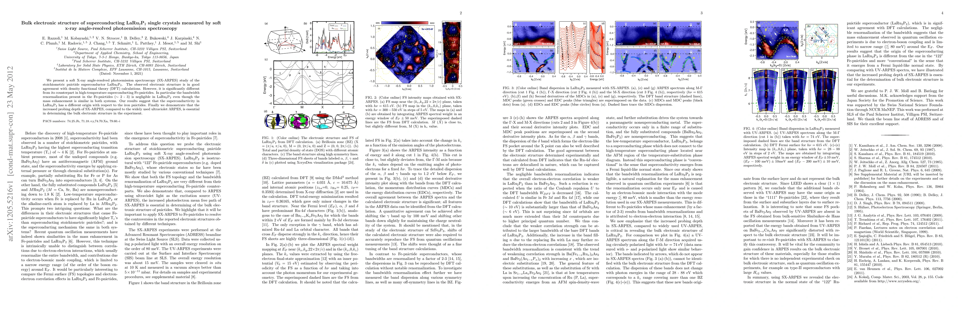 This study utilizes soft X-ray angle-resolved photoemission spectroscopy to analyze the electronic structure of LaRu2P2 superconductors, revealing differences from high-temperature Fe-pnictides and suggesting a distinct superconductivity origin, while highlighting the superior bulk probing depth of SX-ARPES over ultraviolet ARPES.