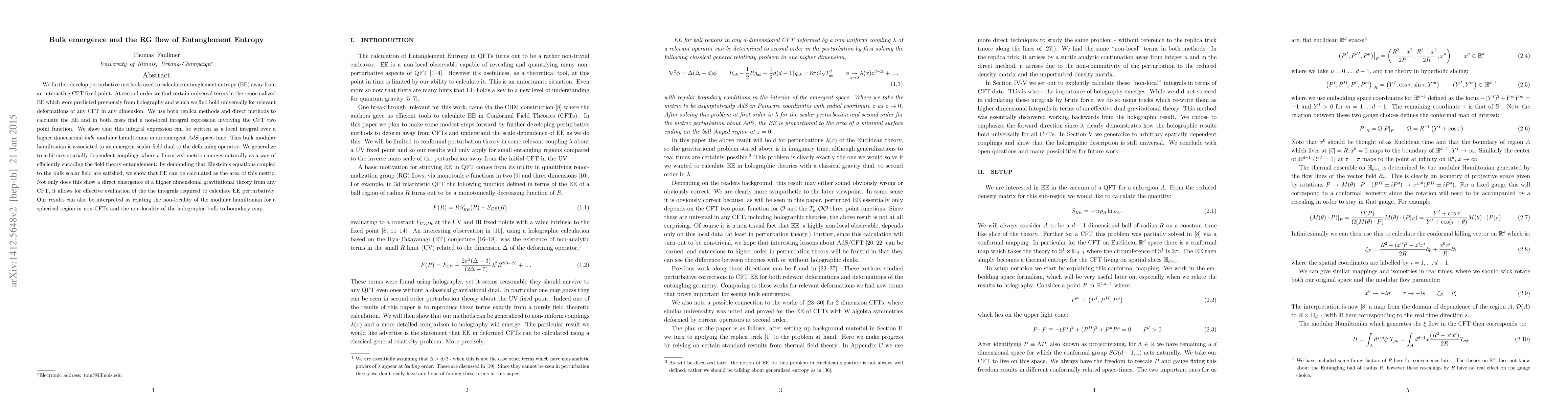 We further develop perturbative methods used to calculate entanglement entropy (EE) away from an interacting CFT fixed point. At second order we find certain universal terms in the renormalized EE which were predicted previously from holography and which we find hold universally for relevant deformations of any CFT in any dimension. We use both replica methods and direct methods to calculate the EE and in both cases find a non-local integral expression involving the CFT two point function. We show that this integral expression can be written as a local integral over a higher dimensional \emph{bulk} modular hamiltonian in an emergent $AdS$ space-time. This bulk modular hamiltonian is associated to an emergent scalar field dual to the deforming operator. We generalize to arbitrary spatially dependent couplings where a linearized metric emerges naturally as a way of efficiently encoding the field theory entanglement: by demanding that Einstein's equations coupled to the bulk scalar field are satisfied, we show that EE can be calculated as the area of this metric. Not only does this show a direct emergence of a higher dimensional gravitational theory from any CFT, it allows for effective evaluation of the the integrals required to calculate EE perturbativly. Our results can also be interpreted as relating the non-locality of the modular hamiltonian for a spherical region in non-CFTs and the non-locality of the holographic bulk to boundary map.