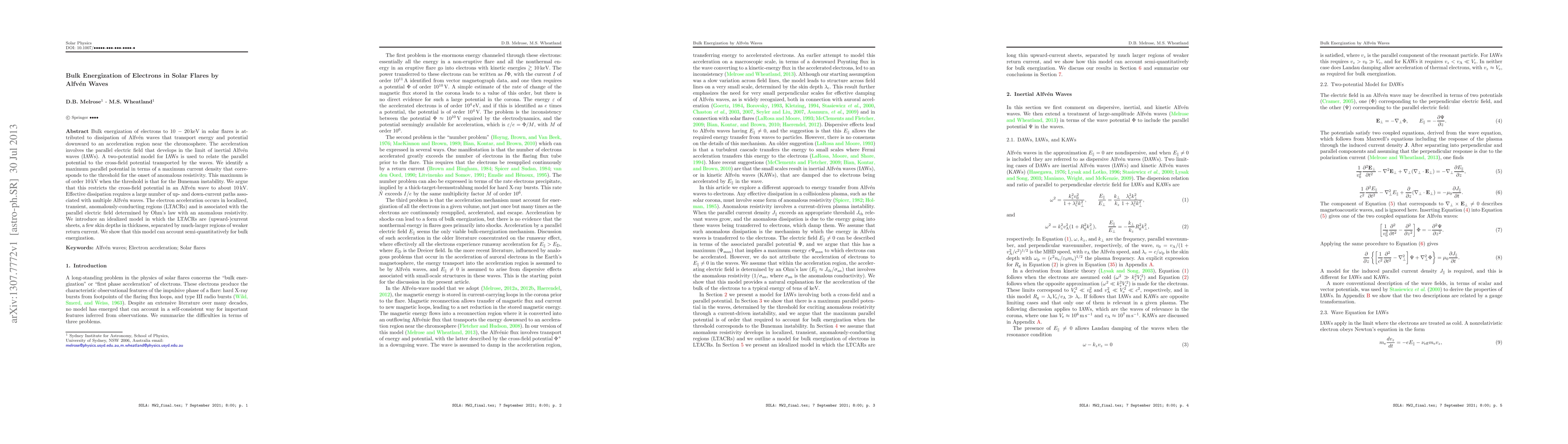 Bulk energization of electrons to $10\,-\,20\,$keV in solar flares is attributed to dissipation of Alfv\'en waves that transport energy and potential downward to an acceleration region near the chromosphere. The acceleration involves the parallel electric field that develops in the limit of inertial Alfv\'en waves (IAWs). A two-potential model for IAWs is used to relate the parallel potential to the cross-field potential transported by the waves. We identify a maximum parallel potential in terms of a maximum current density that corresponds to the threshold for the onset of anomalous resistivity. This maximum is of order $10\,$kV when the threshold is that for the Buneman instability. We argue that this restricts the cross-field potential in an Alfv\'en wave to about $10\,$kV. Effective dissipation requires a large number of up- and down-current paths associated with multiple Alfv\'en waves. The electron acceleration occurs in localized, transient, anomalously-conducting regions (LTACRs) and is associated with the parallel electric field determined by Ohm's law with an anomalous resistivity. We introduce an idealized model in which the LTACRs are (upward-)current sheets, a few skin depths in thickness, separated by much-larger regions of weaker return current. We show that this model can account semi-quantitatively for bulk energization.