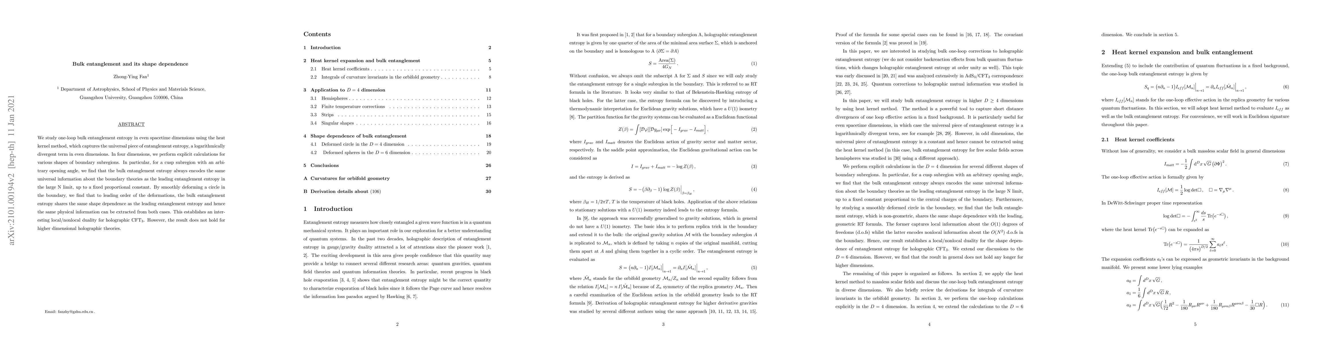 The paper presents detailed calculations using the heat kernel method to derive and analyze the one-loop bulk entanglement entropy in even dimensions, uncovering a local/nonlocal duality for holographic CFT3.