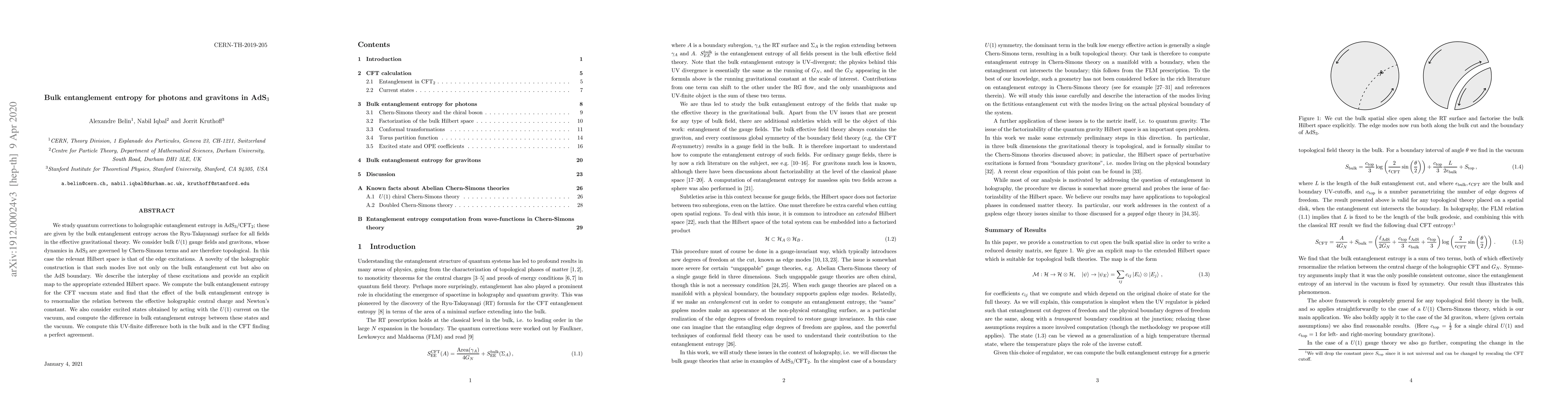 We study quantum corrections to holographic entanglement entropy in AdS$_3$/CFT$_2$; these are given by the bulk entanglement entropy across the Ryu-Takayanagi surface for all fields in the effective gravitational theory. We consider bulk $U(1)$ gauge fields and gravitons, whose dynamics in AdS$_3$ are governed by Chern-Simons terms and are therefore topological. In this case the relevant Hilbert space is that of the edge excitations. A novelty of the holographic construction is that such modes live not only on the bulk entanglement cut but also on the AdS boundary. We describe the interplay of these excitations and provide an explicit map to the appropriate extended Hilbert space. We compute the bulk entanglement entropy for the CFT vacuum state and find that the effect of the bulk entanglement entropy is to renormalize the relation between the effective holographic central charge and Newton's constant. We also consider excited states obtained by acting with the $U(1)$ current on the vacuum, and compute the difference in bulk entanglement entropy between these states and the vacuum. We compute this UV-finite difference both in the bulk and in the CFT finding a perfect agreement.