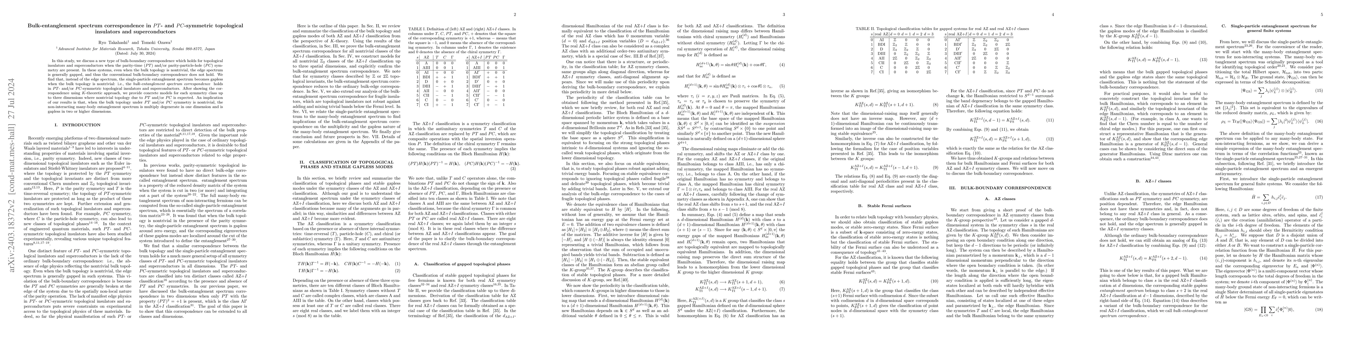 This paper presents a novel bulk-entanglement-spectrum correspondence for topological insulators with $PT$ or $PC$ symmetry, showing that entanglement spectra are gapless when bulk topology is nontrivial, instead of the edge spectrum. It provides concrete models and discusses implications for entanglement degeneracy and gaplessness in different dimensions.