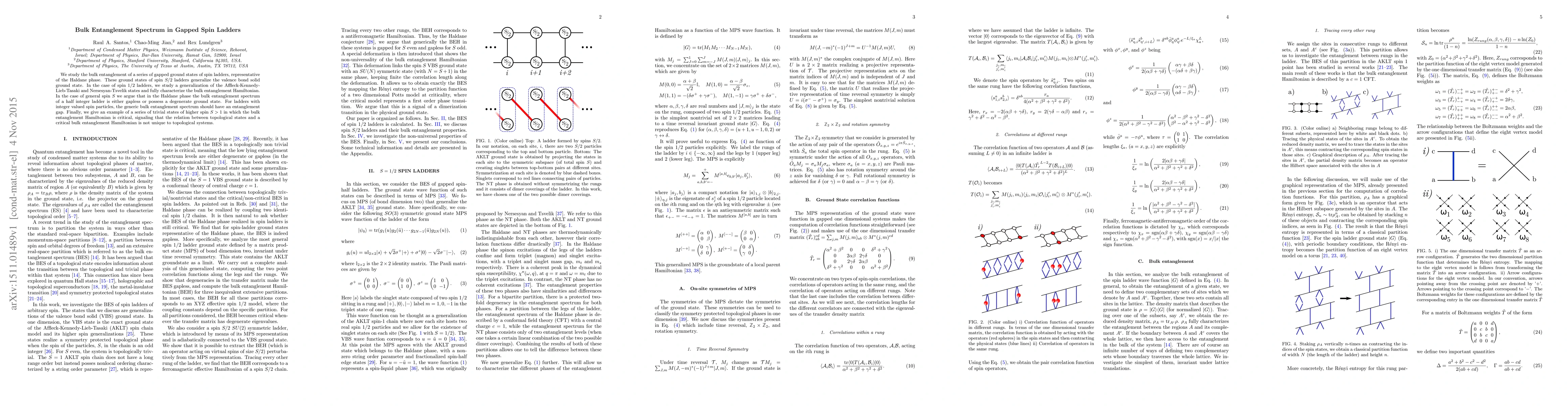 This paper investigates the bulk entanglement spectrum in gapped spin ladders, particularly in the Haldane phase. It characterizes the entanglement Hamiltonian for spin 1/2 ladders and argues that half-integer spin ladders exhibit either gapless or degenerate ground states, while integer spin ladders typically have an entanglement gap.