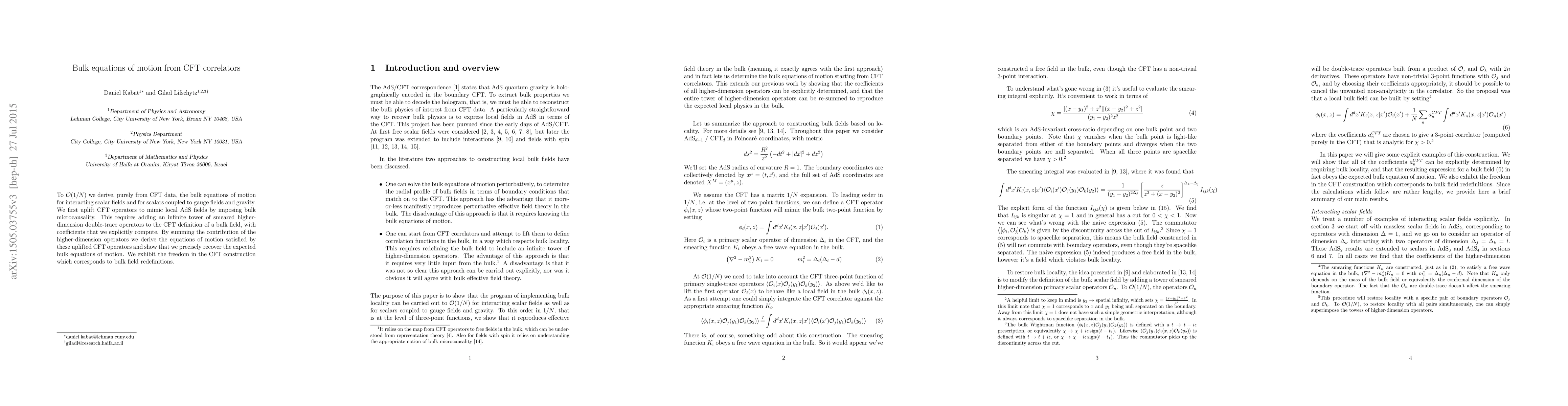 This paper derives bulk equations of motion for interacting scalar fields from CFT correlators to O(1/N) by uplifting CFT operators to mimic local AdS fields, incorporating an infinite tower of higher-dimension double-trace operators, and demonstrating the recovery of expected bulk equations of motion. The study also highlights the freedom in CFT construction corresponding to bulk field redefinitions.