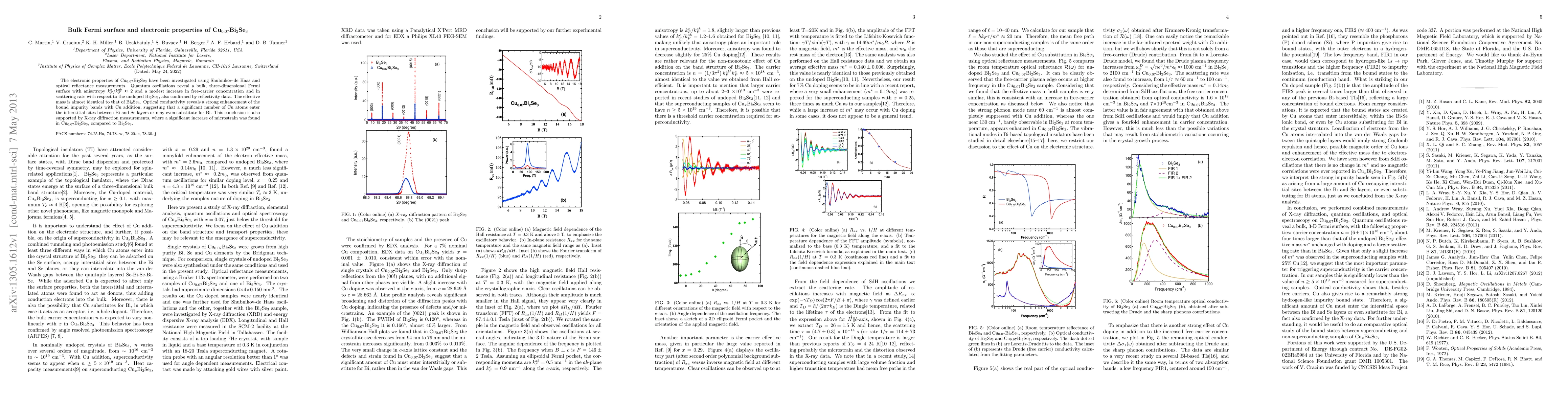 This paper investigates the electronic properties of Cu-doped Bi$_{2}$Se$_{3}$ using quantum oscillations and optical reflectance, revealing a bulk three-dimensional Fermi surface and a modest increase in free-carrier concentration. The study suggests Cu atoms occupy interstitial sites or substitute for Bi, supported by enhanced microstrain observed via X-ray diffraction.