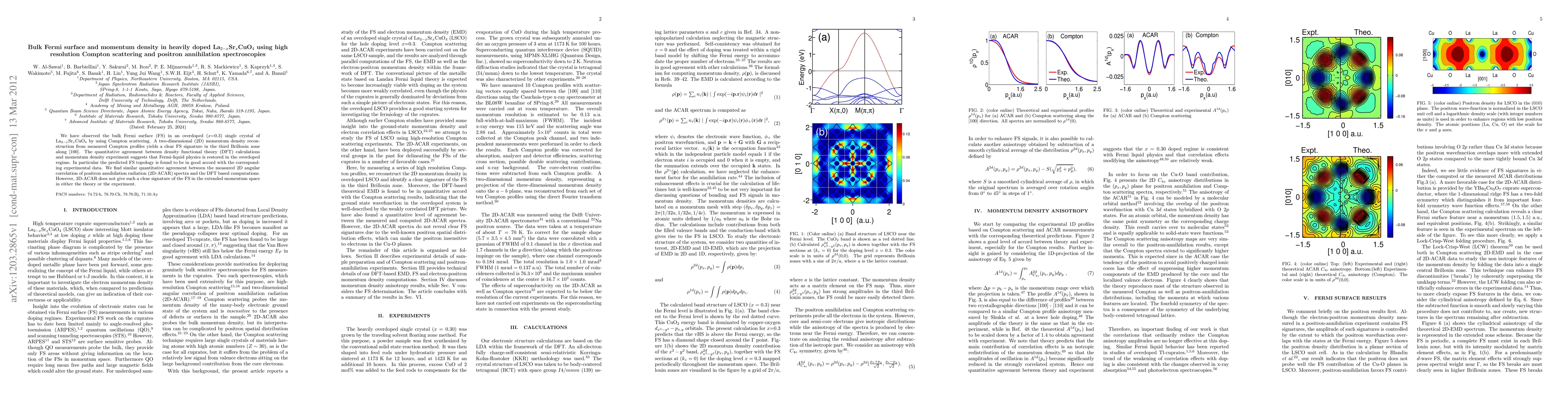 This paper uses Compton scattering and positron annihilation spectroscopies to observe the bulk Fermi surface in overdoped La$_{2-x}$Sr$_x$CuO$_4$, finding agreement between experimental data and density functional theory calculations, indicating restored Fermi-liquid physics in the overdoped regime. While positron annihilation spectra align with theory, they do not clearly reveal the Fermi surface in the extended momentum space.