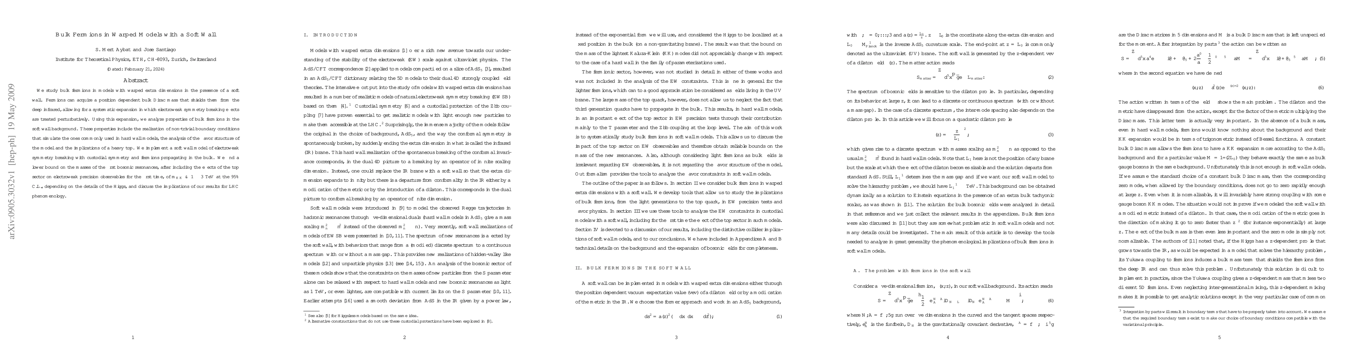 We study bulk fermions in models with warped extra dimensions in the presence of a soft wall. Fermions can acquire a position dependent bulk Dirac mass that shields them from the deep infrared, allowing for a systematic expansion in which electroweak symmetry breaking effects are treated perturbatively. Using this expansion, we analyze properties of bulk fermions in the soft wall background. These properties include the realization of non-trivial boundary conditions that simulate the ones commonly used in hard wall models, the analysis of the flavor structure of the model and the implications of a heavy top. We implement a soft wall model of electroweak symmetry breaking with custodial symmetry and fermions propagating in the bulk. We find a lower bound on the masses of the first bosonic resonances, after including the effects of the top sector on electroweak precision observables for the first time, of m_{KK} \gtrsim 1-3 TeV at the 95% C.L., depending on the details of the Higgs, and discuss the implications of our results for LHC phenomenology.