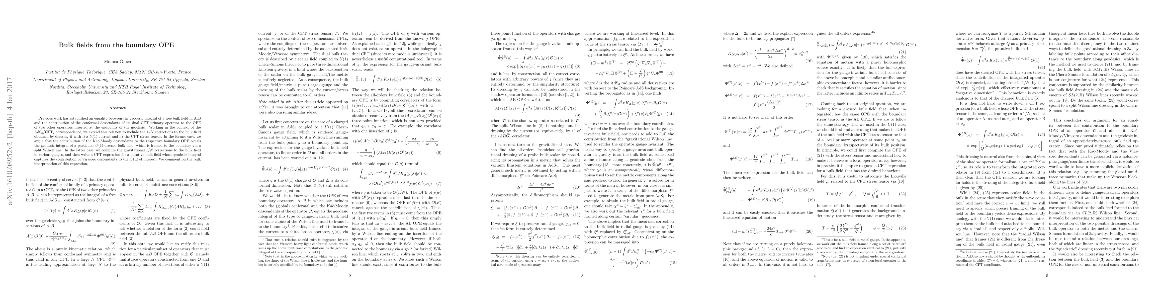 Previous work has established an equality between the geodesic integral of a free bulk field in AdS and the contribution of the conformal descendants of its dual CFT primary operator to the OPE of two other operators inserted at the endpoints of the geodesic. Working in the context of the AdS$_3$/CFT$_2$ correspondence, we extend this relation to include the $1/N$ corrections to the bulk field obtained by dressing it with i) a $U(1)$ current and ii) the CFT stress tensor. In the former case, we argue that the contribution of the Ka\v{c}-Moody descendants to the respective boundary OPE equals the geodesic integral of a particular $U(1)$-dressed bulk field, which is framed to the boundary via a split Wilson line. In the latter case, we compute the gravitational $1/N$ corrections to the bulk field in various gauges, and then write a CFT expression for a putative bulk field whose geodesic integral captures the contribution of Virasoro descendants to the OPE of interest. We comment on the bulk interpretation of this expression.