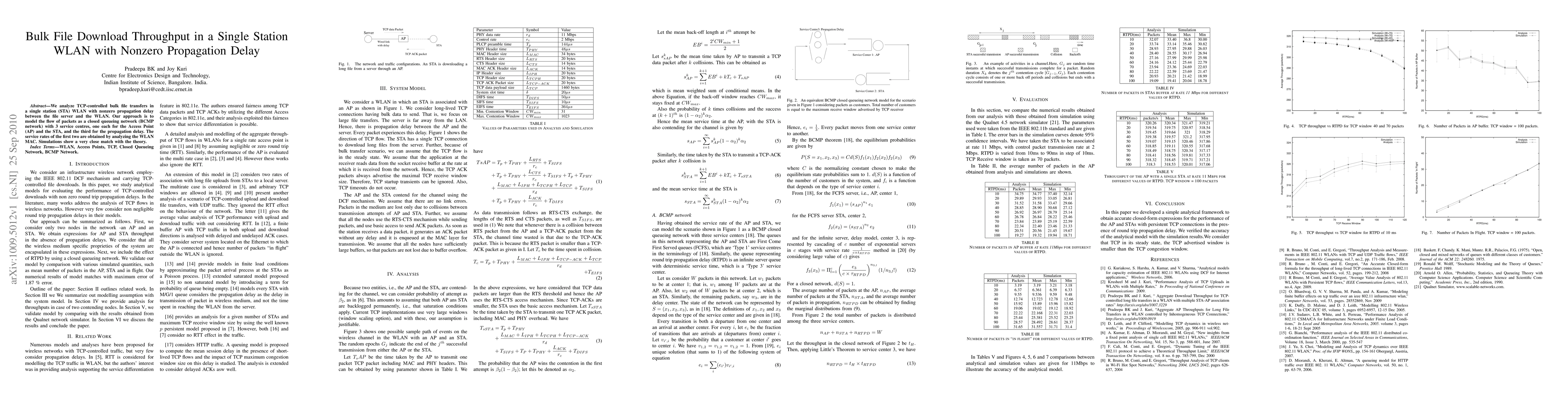 Researchers studied bulk file downloads in a single station WLAN with propagation delay, using a queueing network model that matched simulation results closely.