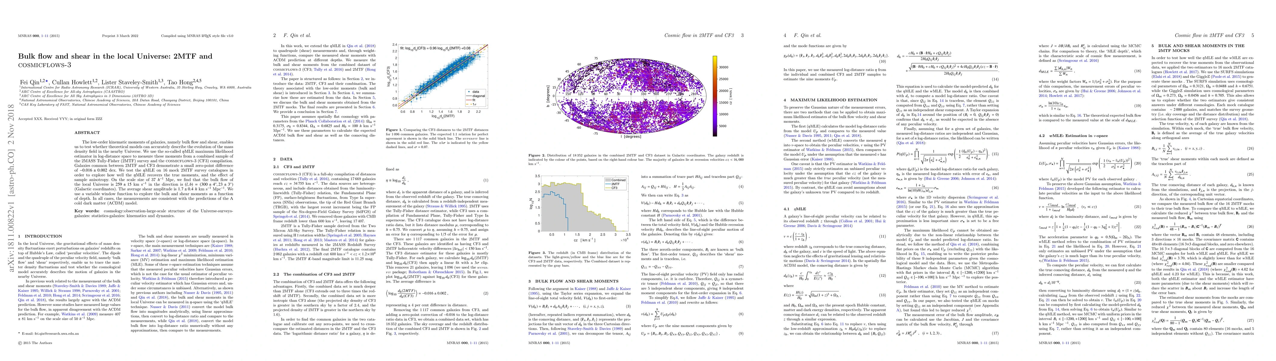 The low-order kinematic moments of galaxies, namely bulk flow and shear, enables us to test whether theoretical models can accurately describe the evolution of the mass density field in the nearby Universe. We use the so-called etaMLE maximum likelihood estimator in logdistance space to measure thesemoments from a combined sample of the 2MASS Tully-Fisher (2MTF) survey and the COSMICFLOWS-3 (CF3) compilation. Galaxies common between 2MTF and CF3 demonstrate a small zero-point difference of -0.016+-0.002 dex.We test the etaMLE on 16 mock 2MTF survey catalogues in order to explore how well the etaMLE recovers the true moments, and the effect of sample anisotropy. On the scale size of 37 Mpc/h, we find that the bulk flow of the local Universe is 259 +- 15 km/h in the direction is (l,b)=(300+-4, 23+-3) (Galactic coordinates). The average shear amplitude is 1.7+-0.4 h km/s/Mpc. We use a variable window function to explore the bulk and shear moments as a function of depth. In all cases, the measurements are consistent with the predictions of the L cold dark matter (LCDM) model.