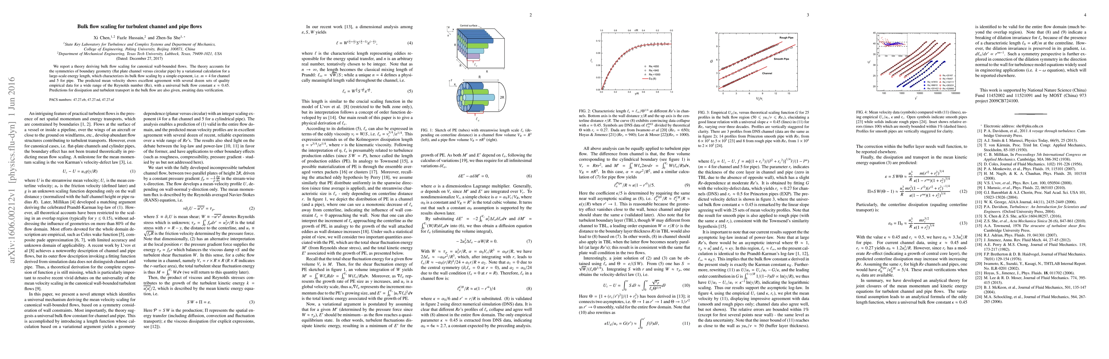 We report a theory deriving bulk flow scaling for canonical wall-bounded flows. The theory accounts for the symmetries of boundary geometry (flat plate channel versus circular pipe) by a variational calculation for a large-scale energy length, which characterizes its bulk flow scaling by a simple exponent, i.e. $m=4$ for channel and 5 for pipe. The predicted mean velocity shows excellent agreement with several dozen sets of quality empirical data for a wide range of the Reynolds number (Re), with a universal bulk flow constant $\kappa\approx0.45$. Predictions for dissipation and turbulent transport in the bulk flow are also given, awaiting data verification.