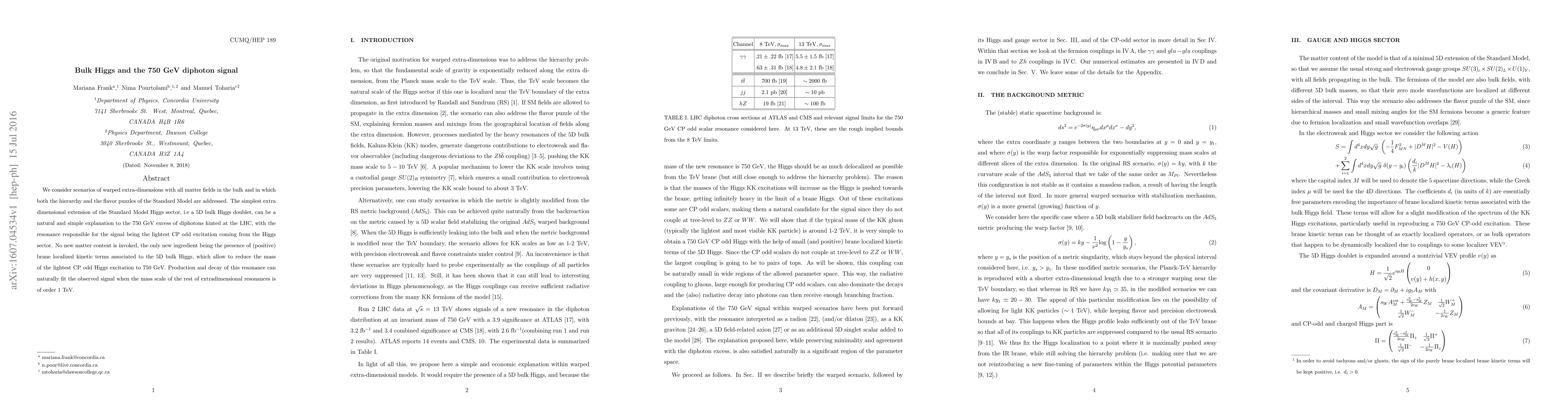 We consider scenarios of warped extra-dimensions with all matter fields in the bulk and in which both the hierarchy and the flavor puzzles of the Standard Model are addressed. The simplest extra dimensional extension of the Standard Model Higgs sector, i.e a 5D bulk Higgs doublet, can be a natural and simple explanation to the 750 GeV excess of diphotons hinted at the LHC, with the resonance responsible for the signal being the lightest CP odd excitation coming from the Higgs sector. No new matter content is invoked, the only new ingredient being the presence of (positive) brane localized kinetic terms associated to the 5D bulk Higgs, which allow to reduce the mass of the lightest CP odd Higgs excitation to 750 GeV. Production and decay of this resonance can naturally fit the observed signal when the mass scale of the rest of extradimensional resonances is of order 1 TeV.
