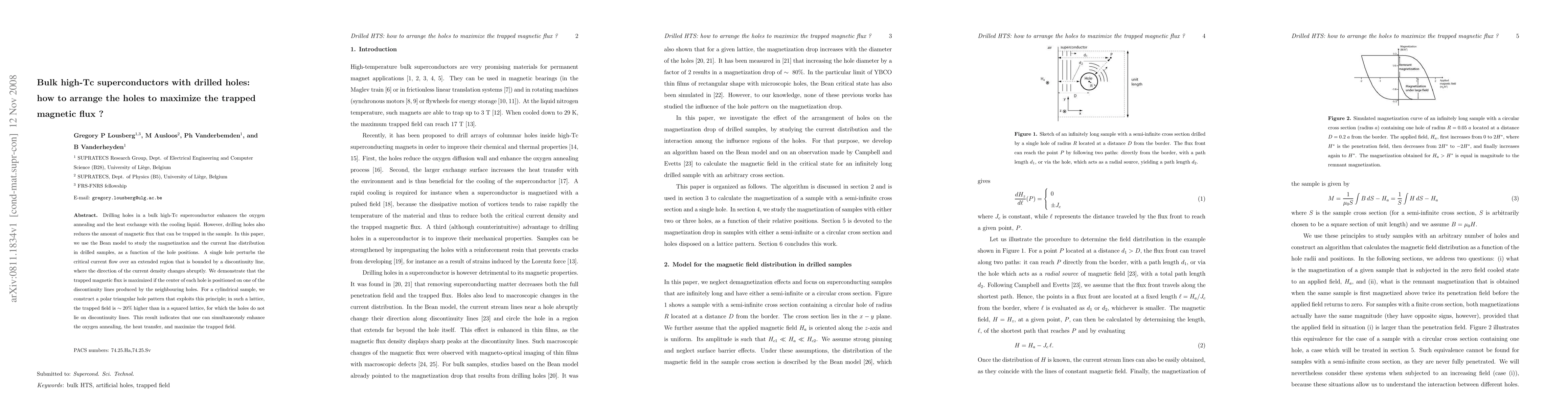 Drilling holes in a bulk high-Tc superconductor enhances the oxygen annealing and the heat exchange with the cooling liquid. However, drilling holes also reduces the amount of magnetic flux that can be trapped in the sample. In this paper, we use the Bean model to study the magnetization and the current line distribution in drilled samples, as a function of the hole positions. A single hole perturbs the critical current flow over an extended region that is bounded by a discontinuity line, where the direction of the current density changes abruptly. We demonstrate that the trapped magnetic flux is maximized if the center of each hole is positioned on one of the discontinuity lines produced by the neighbouring holes. For a cylindrical sample, we construct a polar triangular hole pattern that exploits this principle; in such a lattice, the trapped field is ~20% higher than in a squared lattice, for which the holes do not lie on discontinuity lines. This result indicates that one can simultaneously enhance the oxygen annealing, the heat transfer, and maximize the trapped field.