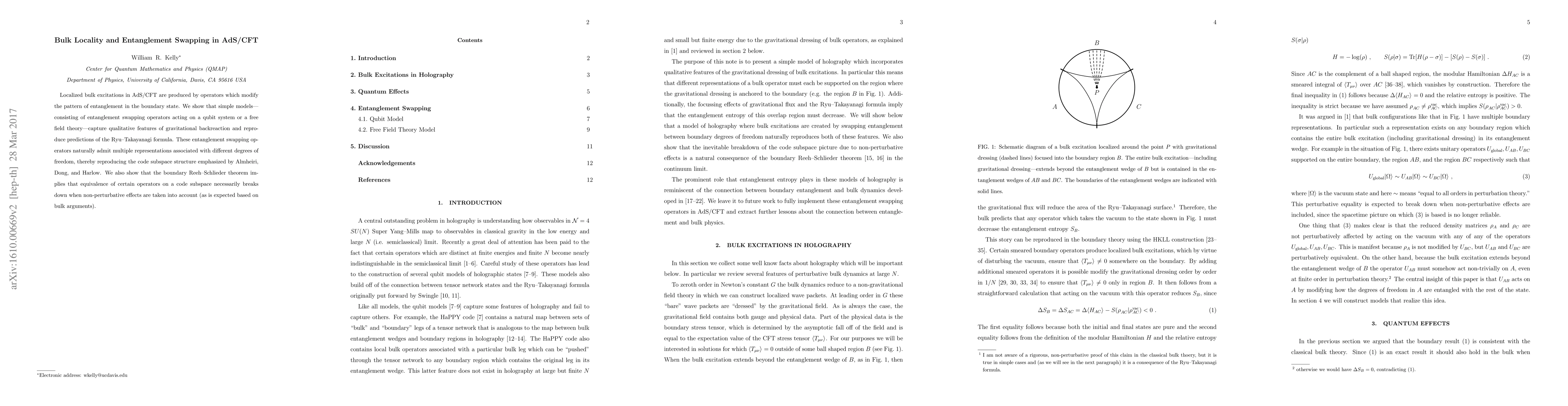 Localized bulk excitations in AdS/CFT are produced by operators which modify the pattern of entanglement in the boundary state. We show that simple models--consisting of entanglement swapping operators acting on a qubit system or a free field theory--capture qualitative features of gravitational backreaction and reproduce predictions of the Ryu-Takayanagi formula. These entanglement swapping operators naturally admit multiple representations associated with different degrees of freedom, thereby reproducing the code subspace structure emphasized by Almheiri, Dong, and Harlow. We also show that the boundary Reeh-Schlieder theorem implies that equivalence of certain operators on a code subspace necessarily breaks down when non-perturbative effects are taken into account (as is expected based on bulk arguments).
