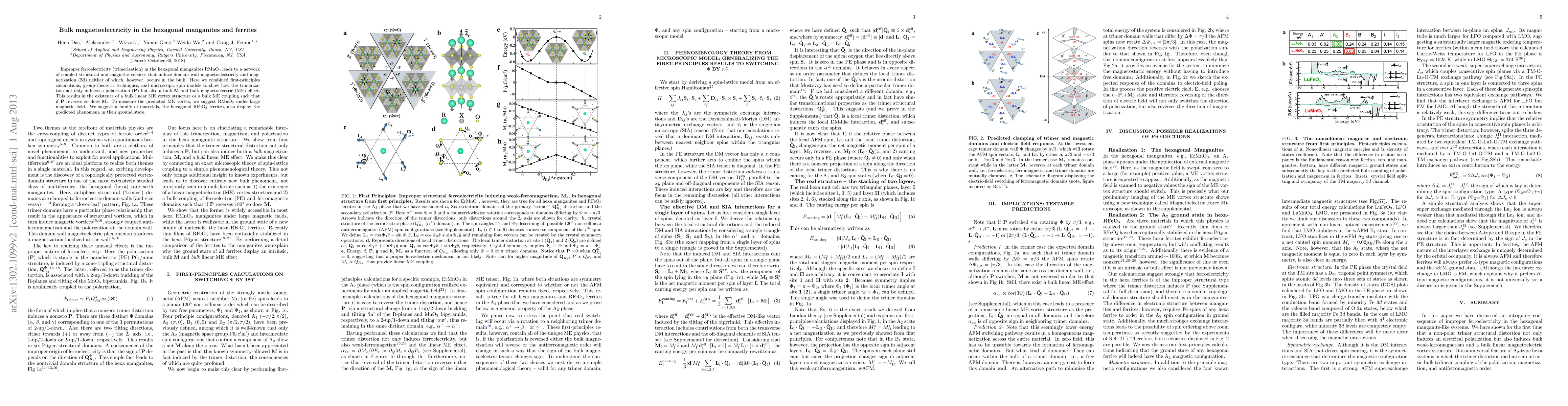 Improper ferroelectricity (trimerization) in the hexagonal manganites RMnO$_3$ leads to a network of coupled structural and magnetic vortices that induce domain wall magnetoelectricity and magnetization neither of which, however, occurs in the bulk. Here we combined first-principles calculations, group-theoretic techniques, and microscopic spin models to show how the trimerization not only induces a polarization but also a bulk magnetization and bulk magnetoelectric (ME) effect. This results in the existence of a bulk linear ME vortex structure or a bulk ME coupling such that if direction of polarization reverses so does magnetization. To measure the predicted ME vortex, we suggest RMnO$_3$ under large magnetic field. We suggest a family of materials, the hexagonal RFeO$_3$ ferrites, also display the predicted phenomena in their ground state.