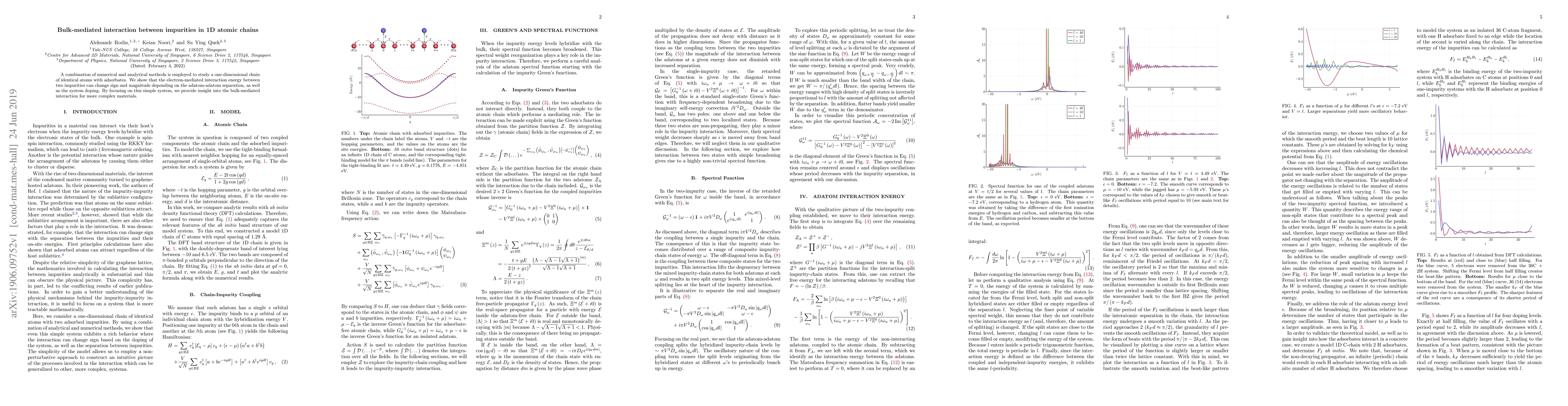 A combination of numerical and analytical methods is employed to study a one-dimensional chain of identical atoms with adsorbates. We show that the electron-mediated interaction energy between two impurities can change sign and magnitude depending on the adatom-adatom separation, as well as the system doping. By focusing on this simple system, we provide insight into the bulk-mediated interaction for more complex materials.