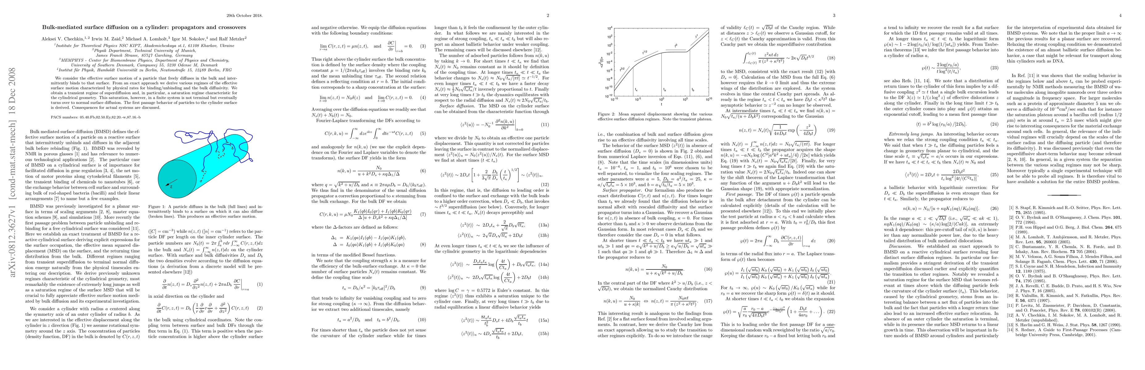 We consider the effective surface motion of a particle that freely diffuses in the bulk and intermittently binds to that surface. From an exact approach we derive various regimes of the effective surface motion characterized by physical rates for binding/unbinding and the bulk diffusivity. We obtain a transient regime of superdiffusion and, in particular, a saturation regime characteristic for the cylindrical geometry. This saturation, however, in a finite system is not terminal but eventually turns over to normal surface diffusion. The first passage behavior of particles to the cylinder surface is derived. Consequences for actual systems are discussed.
